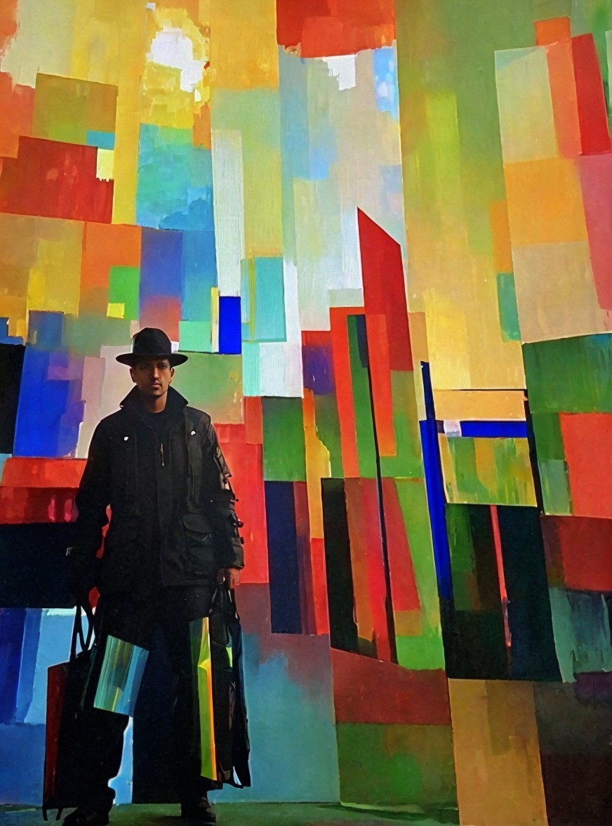Person holding suitcases in room with vibrant geometric patterns.