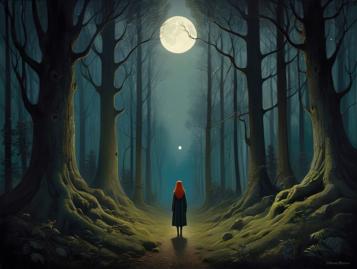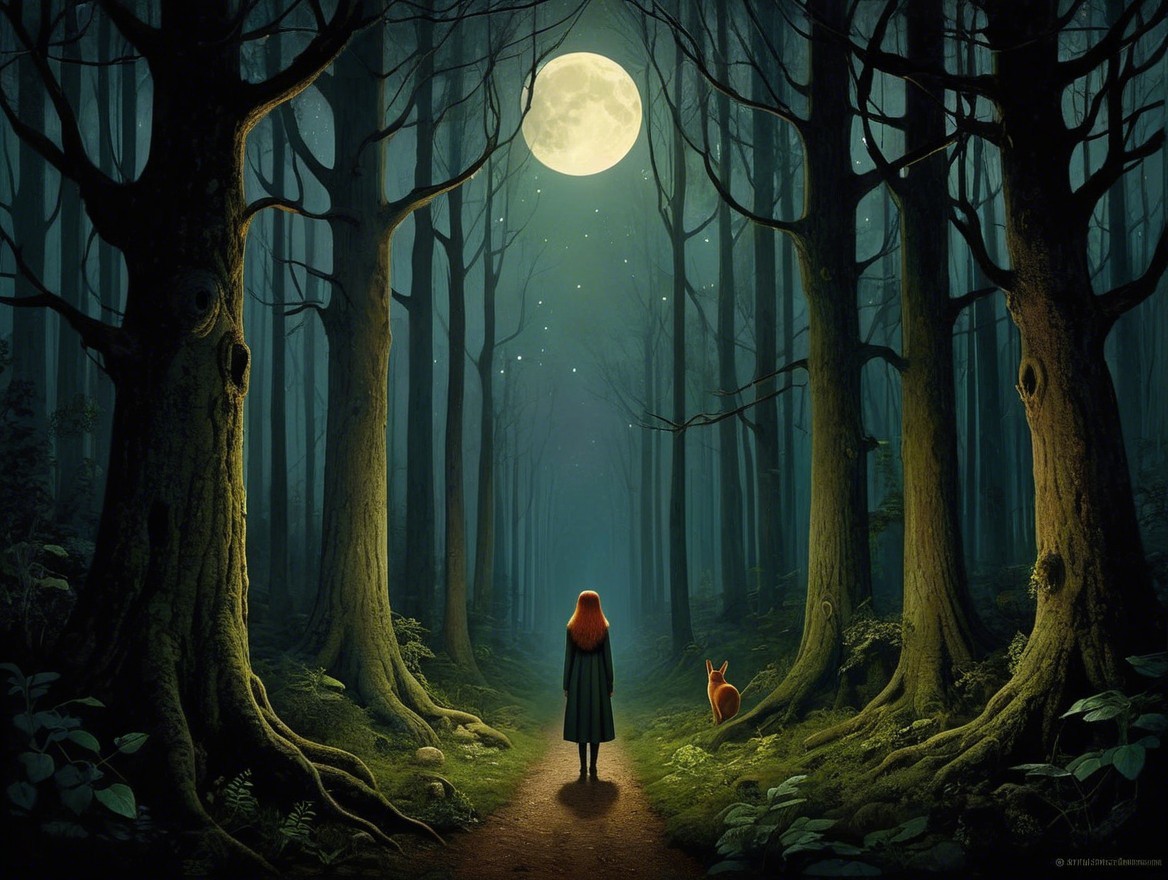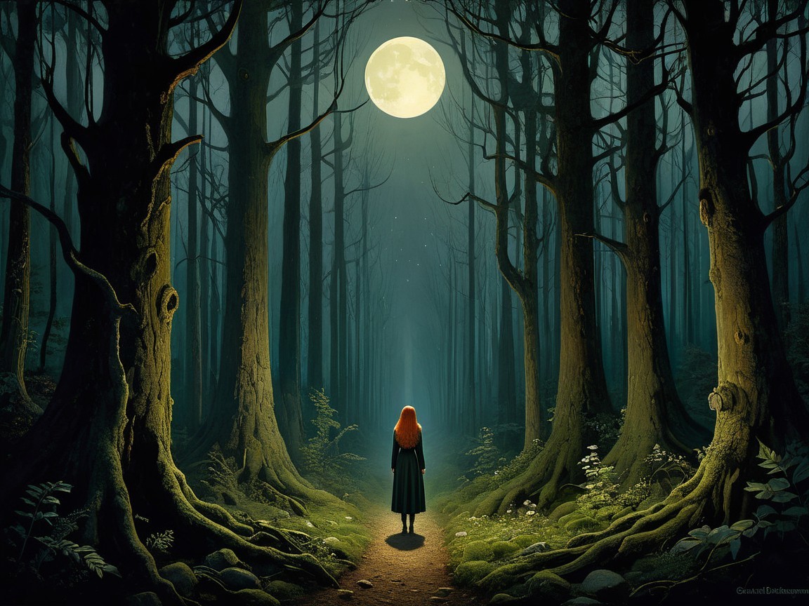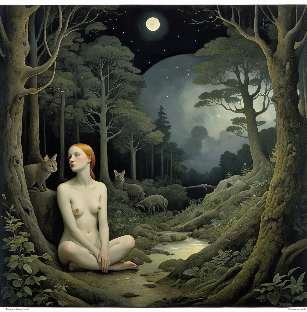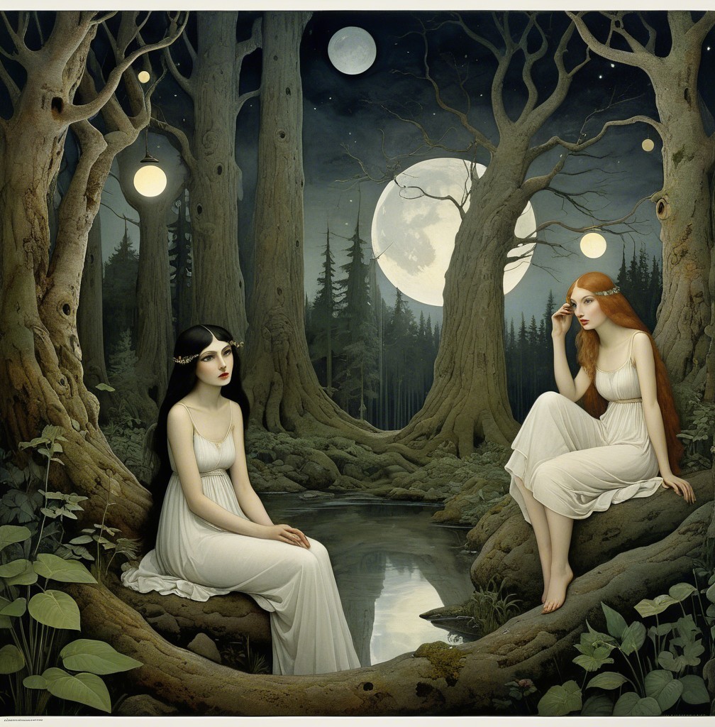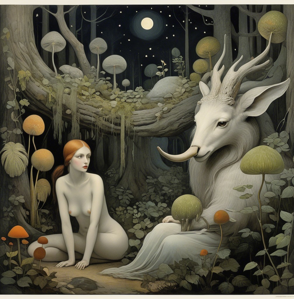 A mystical scene featuring a serene woman with long dark hair and antlers, sitting beside a gentle deer. Surrounded by vibrant butterflies and a moonlit forest, it evokes enchantment and harmony.