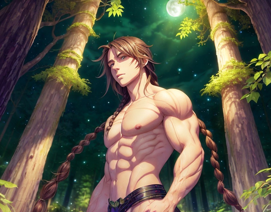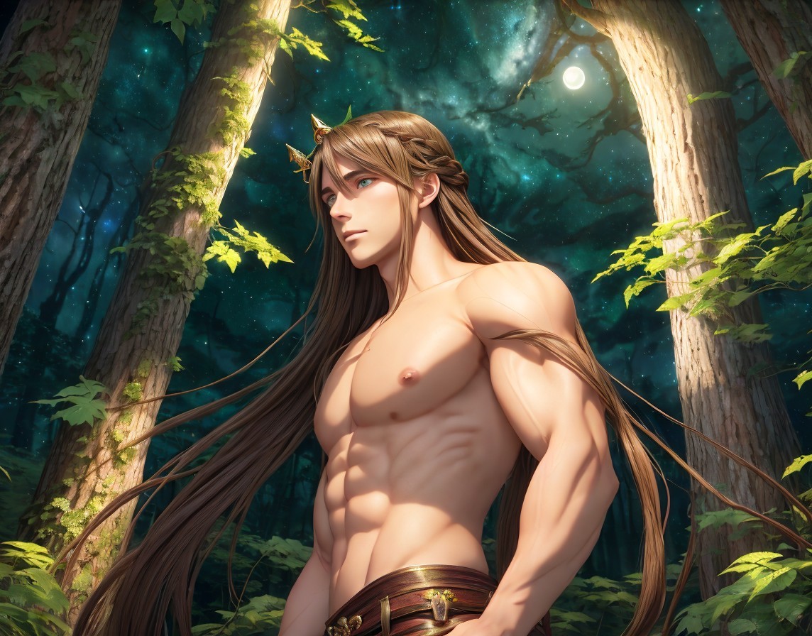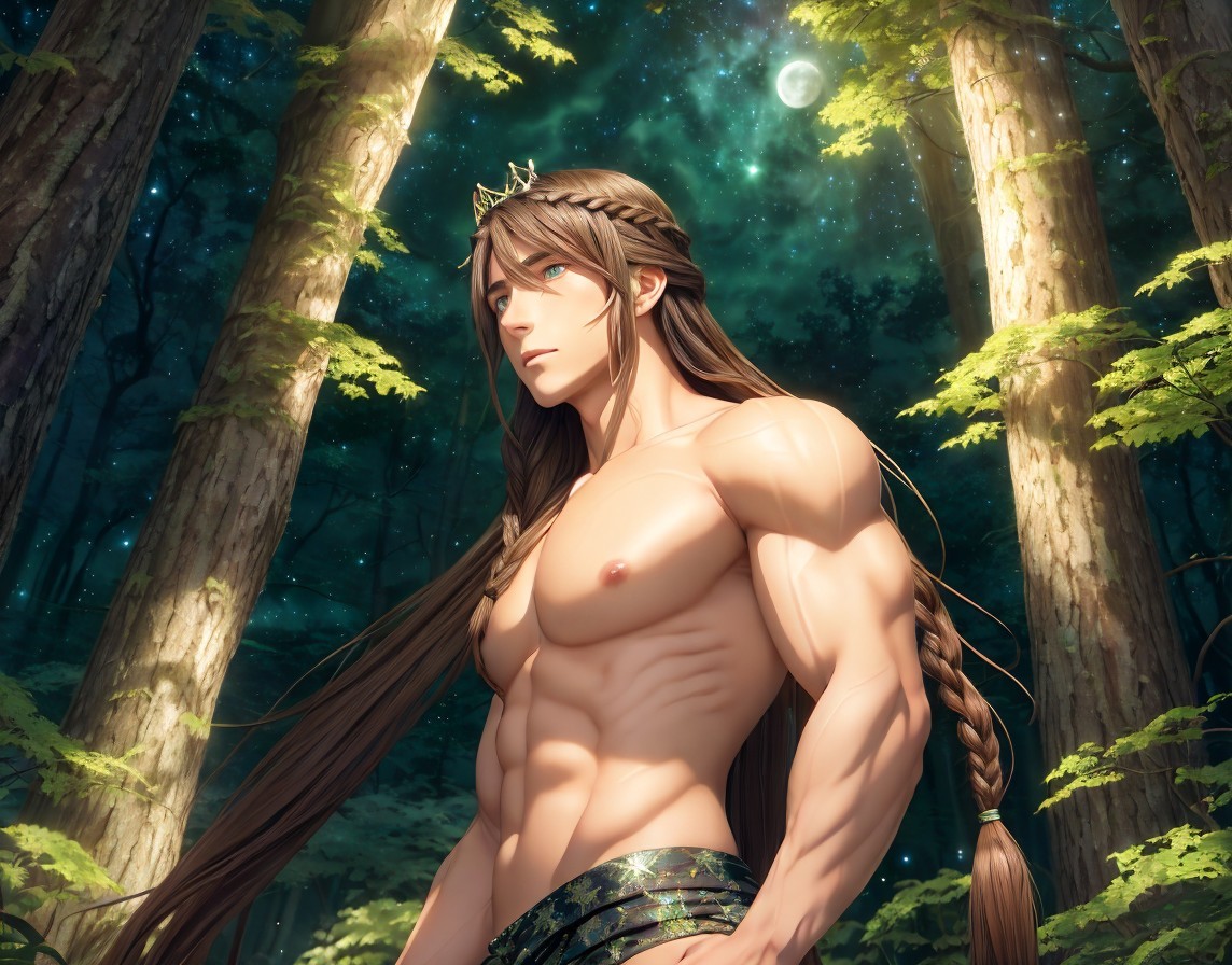 An illustration of a muscular fantasy character with long hair and a crown standing in a moonlit forest.