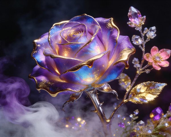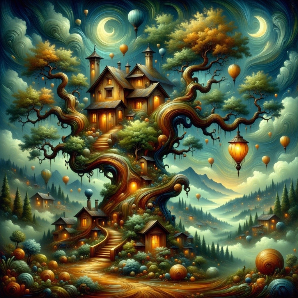 Prompt: Create an enchanting fantasy scene featuring a large, gnarled tree with a twisted trunk, its branches elegantly arching outwards. Atop the tree, an assortment of whimsical houses with colorful rooftops and tiny windows create a picturesque village atmosphere. The houses are adorned with delicate details, each illuminated from within, casting a warm glow. Vintage-style hot air balloons float gently above, adding to the surreal ambiance. Below, from the trunk, a lantern hangs, glowing softly in the dim light and accentuating the intricate texture of the bark.