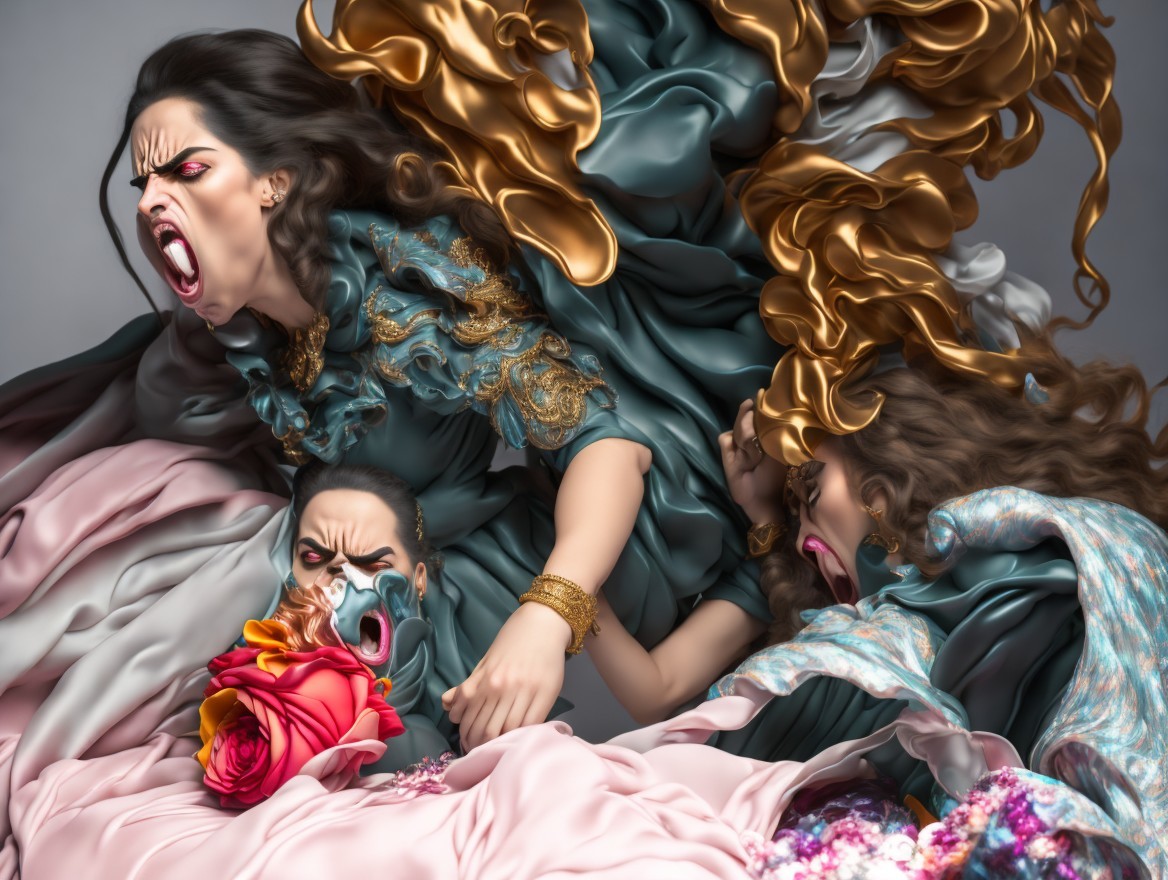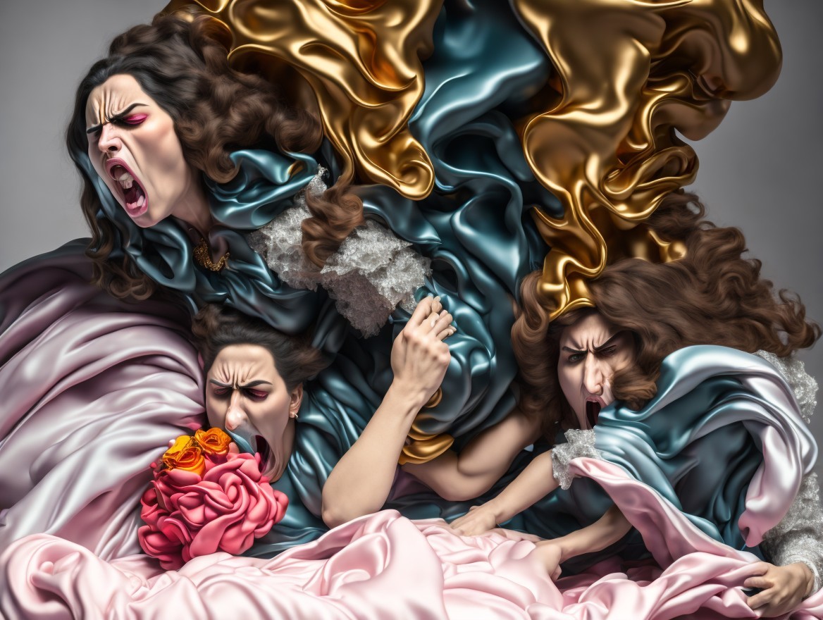 Surreal artwork with anguished faces and flowing hair