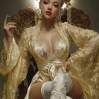 A photo of an Asian actress, with a low-stitched style, silky waist-length ancient style cosplay, plump and round body, shiny and transparent reflection, classical hairstyle, oily stockings, oily lips, earrings, solo, extremely clear lens, bright lighting, open back sitting on a high stool, professional photography, high resolution, ultra-definition shooting, highest picture quality in Schiele -- Wyeth Style Detailed Illustration Of The Goddess in chrome android suit body by Hajime Sorayama, in Tarot lay-out from Mucha, 80's black space suit, Full Body, Comic Book Style, Digital Painting, An Absolutely Gorgeous Princess Rey In A Shot White Latex Body Suit Braided Bun Silver Necklace, In A galaxy, Whimsical, Colorful, Fantasy, Intricate, Meticulously Detailed, Masterpiece By Jean Giraud, Intricate Details, Iridescent, Vivid Colours, wearing a delicate haute couture outfit while posing for vogue magazine in a precious hidden garden, Sakimi Chan, George Kamitani, Akira Yasuda, Alfon, Greg Gratkoski, Gil Elfgren, William Adolph Bougeleau, greg rutkowski, A striking figure poses in metallic attire, surrounded by glowing flowers and rocks. The ethereal background features a radiant halo, enhancing the futuristic and celestial vibe of the scene.
