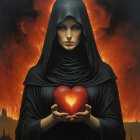 Mysterious figures in black cloaks and hoods hold a Halloween carved pumpkin, which mysteriously glows from within. Night sky, galaxy motifs, gothic , starlight reflections, dark energy, shimmering dark tones, haunting atmosphere, macabre, occult, surreal fantasy, intricate details, high contrast shadows, oranges , blues, golden and blacks, dramatic lighting.