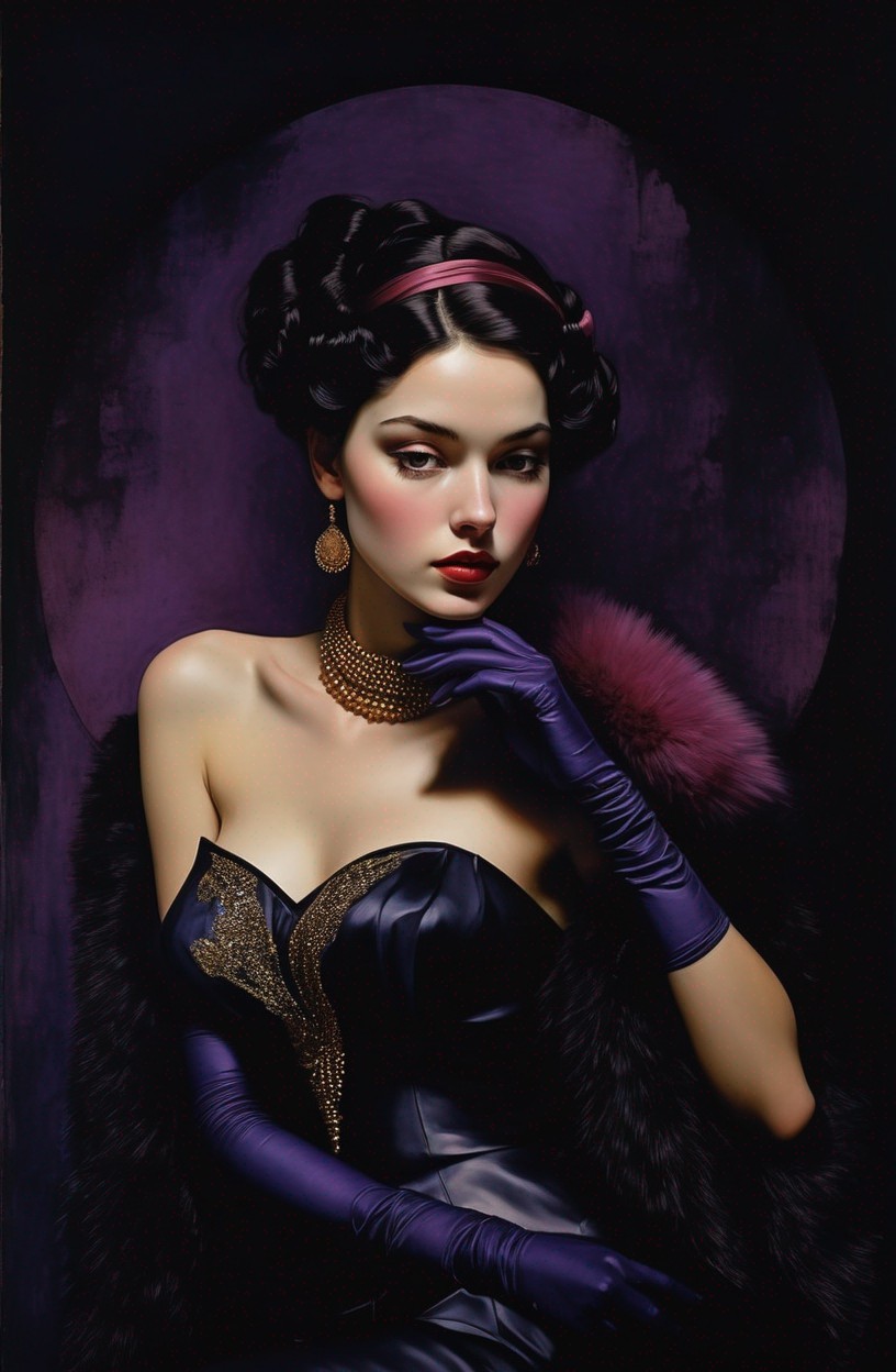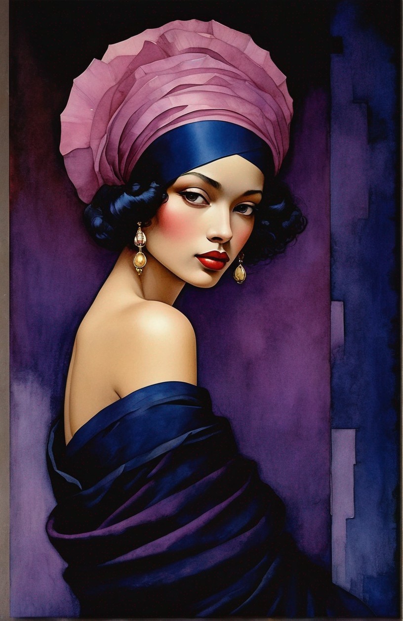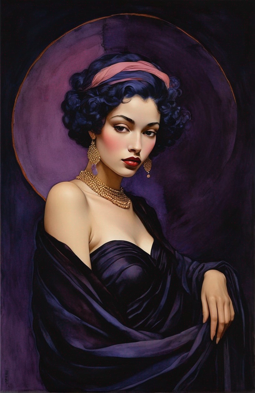 Prompt: Beautiful dark woman in the style of WALTER MARTIN BAUMHOFER and rené gruauwhimsical, beautiful, poignant, touching. colors pink, violet, gold, rust, indigo, burgundy, black. soft watercolor extra water in Art Deco by Annigoni, Egon Schiele, Milo Manara, Botticelli, Catrin Welz-Stein, Jean Metzinger, Klimt, perfect eyes, perfect hands face , highly detailed, complementary colors, hyper detailed. Watercolor and ink splatter, dynamic pose,