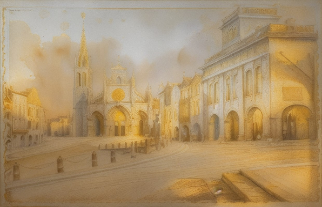 Prompt: A watercolor and ink sketch with a soft palette of a range of light yellow shades and hints of gold. The drawaing must remain white above tke skyline