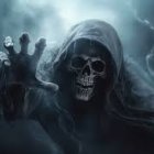 A dark, hooded figure with a skeletal face leans forward, its glowing blue eyes piercing through the shadows. Behind it, wisps of smoke swirl, adding to the eerie atmosphere.