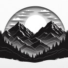 Black Mountain - a black and white, monochrome image resembling a paper cutout: a high, black mountain with two peaks, pine trees at the foot of the mountain and the rising sun, clouds above the mountain; minimalist style...