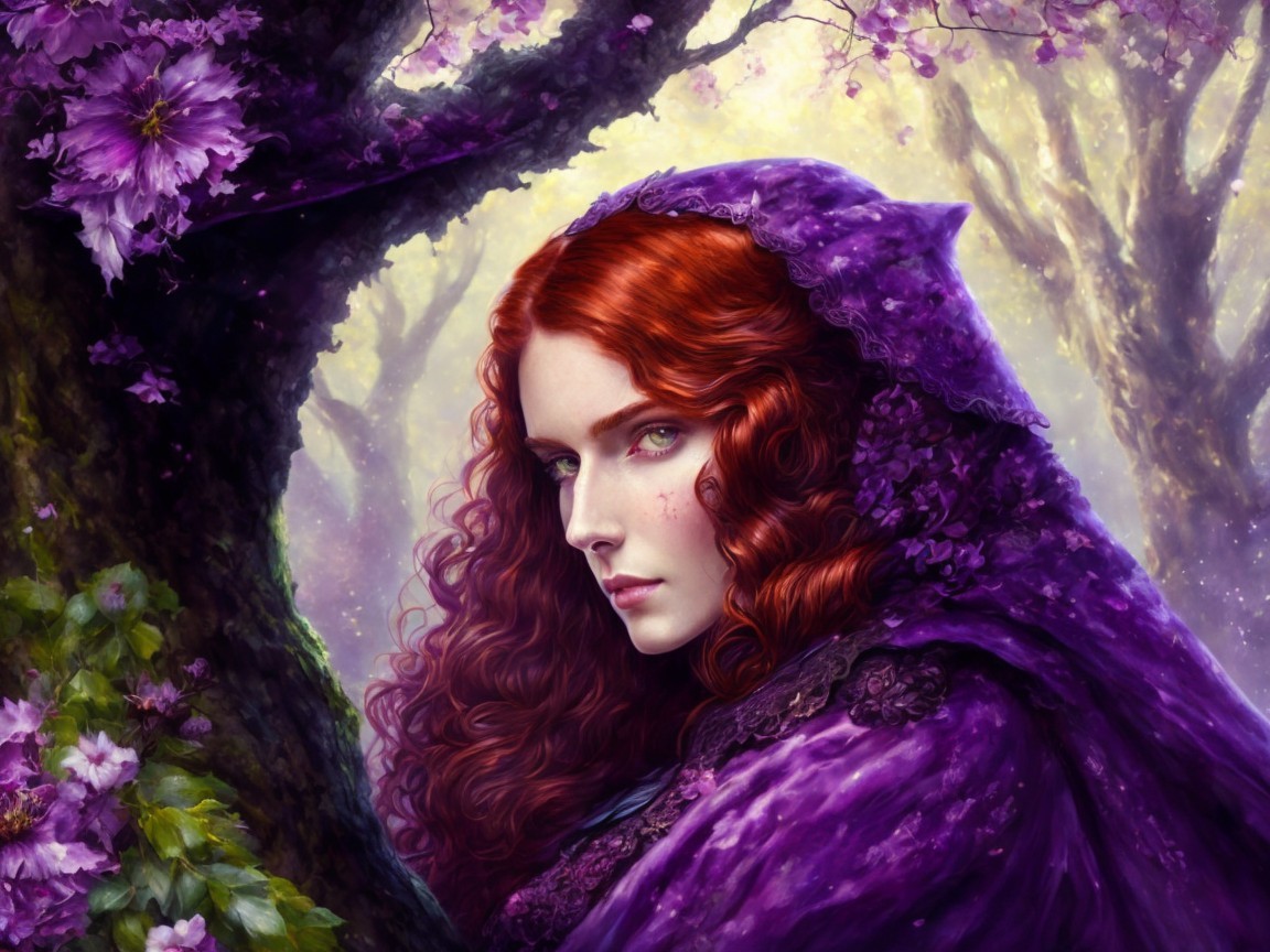 A woman with striking red curls gazes pensively from beneath a rich purple hood. Surrounded by blooming trees, her expression blends mystery and beauty against a soft, ethereal backdrop.