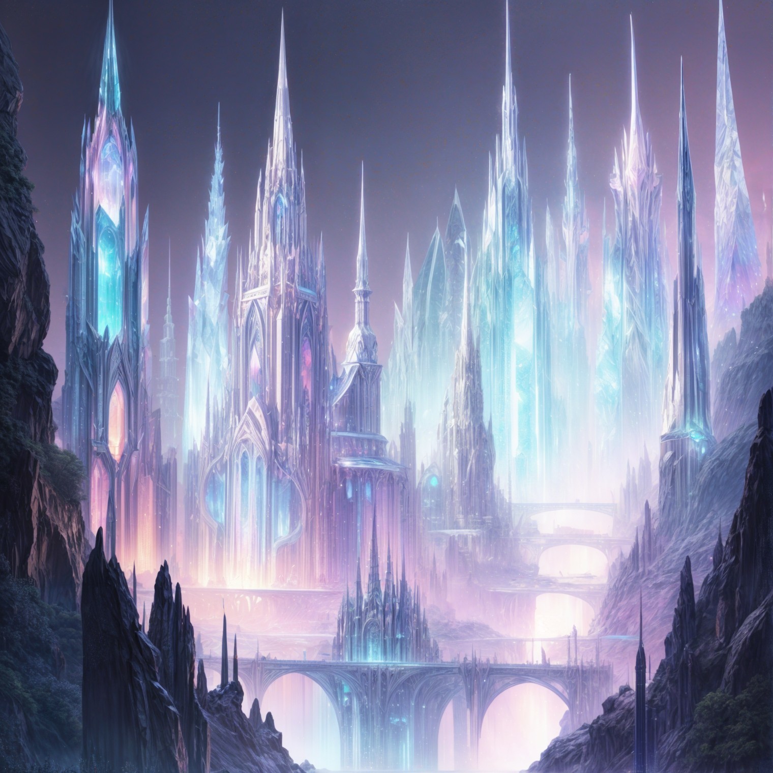 A breathtaking fantasy landscape features towering, crystalline structures reflecting a mystical glow. Ethereal bridges connect majestic castles amidst a serene, foggy ambiance.