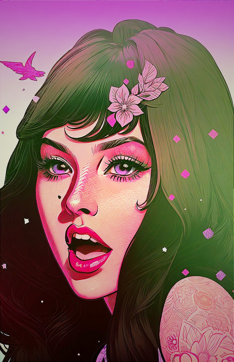 Stylized woodblock print in style of pop art portrait of marvellous teenage temptress surrounded by cosmic background, comical sketch art, geometrical illustrative style merged with storybook illustration, triadic color scheme pink beige purple, style of Florianne Becker, Overton Loyd, Lin Fengmian, John Reuss, Jean-Sebastien Rossbach, Marianne Stokes, Justin Gaffrey, John Lowrie Morrison, Patty Maher, soft pastel colors, watercolors and ink, beautiful, intricate, crisp quality, delicate colours.line-art, sgraffito, gothical horror, raytraced, intricate lineage illustration, stylized illustration inspired by grant wood, Megan Duncanson, 3d effects 1.8, ambient occlusion 1.5, anisotropic filtering 1.2, raytraced shadows 1.3, subtle, triadic color scheme Emerald black pink, comical, high coloring, intricate flowing hair in zentangle method, ferocious, coherent, hues, symmetrical, muscular, highlighted, raytraced shadows 1.2, heretic, traumacore 1.2, retrofuturistic, retropunk, translucent details, stylized illustration 1.8, dethereal, dynamic flourescent lighting 1.7, soft rounded edges, muted limited pallet, coffinwood 1.2, saturated colors, abstract illustration, Radiance, brightness 1.2, anglo gothic 1.6, devilish eyes 1.7, american gothic 1.7, dimmed lighting, scales, shadow mapping 1.3, very colorful, ansteact, concept art, mystery essence, ambient occlusion 1.5, layered geometrical vector art, vector 9:5, saturated colors,