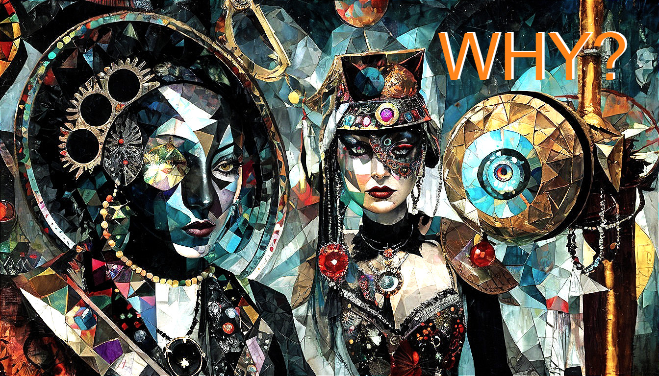 The artwork features two striking figures with bold, geometric patterns and vibrant colors. Their elaborate attire and expressive features create a captivating, mysterious atmosphere. "WHY?" stands out prominently.