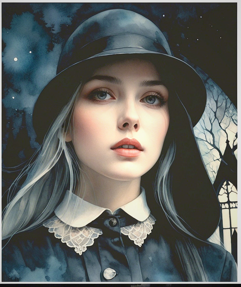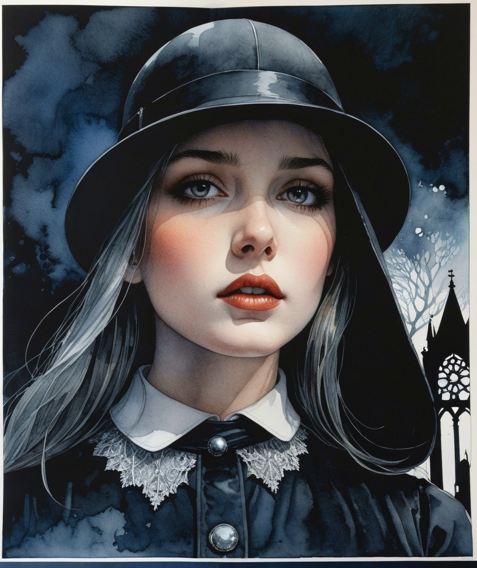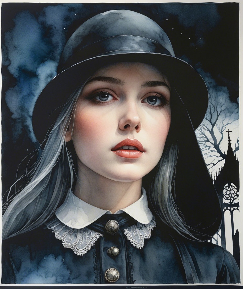 Prompt: A hauntingly ethereal watercolor portrait by Kurt Roesch and Paul Kidby, bowler hat with gothical details and felt fabric textures, blending ominous and fantastical elements in a dreamlike setting. French comic book art Infused with Gothic pen and ink details, diffusion, displacement mapping, dendritic structures and patterns that give it an otherworldly appearance, half-lit pores, fine lines, natural asymmetry, painterly effects, visible porcelain skin texture akin to kitsunegari, imaginative absurdism, detailed neck and throat, enhanced gradients, warm back-lit glow, cymatics vortex background, airbrushed fine lines, eerie and eldritch undertones reminiscent of Leonora Carrington and Naoto Hattori's styles, influences from Ed Binkley, provocative narrative. The lighting, inspired by Magritte and Alex Hirsch, adds a surreal touch,surreal sketchbook art, tesselated, micro-level intricacy, plasticity 1.3, large-scale complexity, colorful line-art by William Bradley, suppleness, flexibility, softness, pliability, malleability, litheness triadic color scheme metallic-honey deep-ochre light-green, micro-pen lineage, flowing line-art by William Bradley, hues by Ho Baron and Ed Binkley, vibrant color palette, dynamic lighting 1.3, intricate patterns, catenaries, delicate linework, revealing, lascivous, sleazy, magical atmosphere, intricate bas-relief effects, blurred background, contoured, dyed, debeh, bokeh, dof, moving, accelerated, action painting reminiscence, unique, warm coloring with ink lines over watercolor effects, tesselated, stylized, stippled, blotting, watercoloring techniques, tousled, overexposed, brightness 1.3, pen and ink style, posing, motility, quillling, intricate and detailed with crisp quality. Incorporate a colorful tribal complementary color scheme with thinned paint for 3D effects and subsurface scattering 1.3 for watercolor washes in warm tones, casually textured layers,intricate line art, diffused highlights, mip-mapping textures, glossy shimmering effects, collagraphy with low key lighting, contrasting textures, translucent geometry, elegant geometric features, imperial colors, dark tones, dynamic accents, illusion of depth, sgraffito masterpiece style, embossed hues and contourings, small brushstrokes, contourings, defined edges, tiny and lean lines, orphism, abstracted collage reminiscence, fusion of synthetic essence and abstract art, color palette inspired by William Bradley's and Carne Griffith's coloring style, included paper cuts,displacement mapping, plasmatic hatchings, scratched edges, cel-shaded style, Emshwiller influence, sfumato, Bloom-Effect, interpolated, serene expressionism by Michael Cheval, anti-aliasing, deep scale and perspective, surrealism, mip-mapping, phong shading 1.3, texture mapping 1.3, luminousity 1.3, crackling lightning, fuzzy textures, and linty details with strict outlines, all contributing to a mesmerizing and mysterious visual experience.