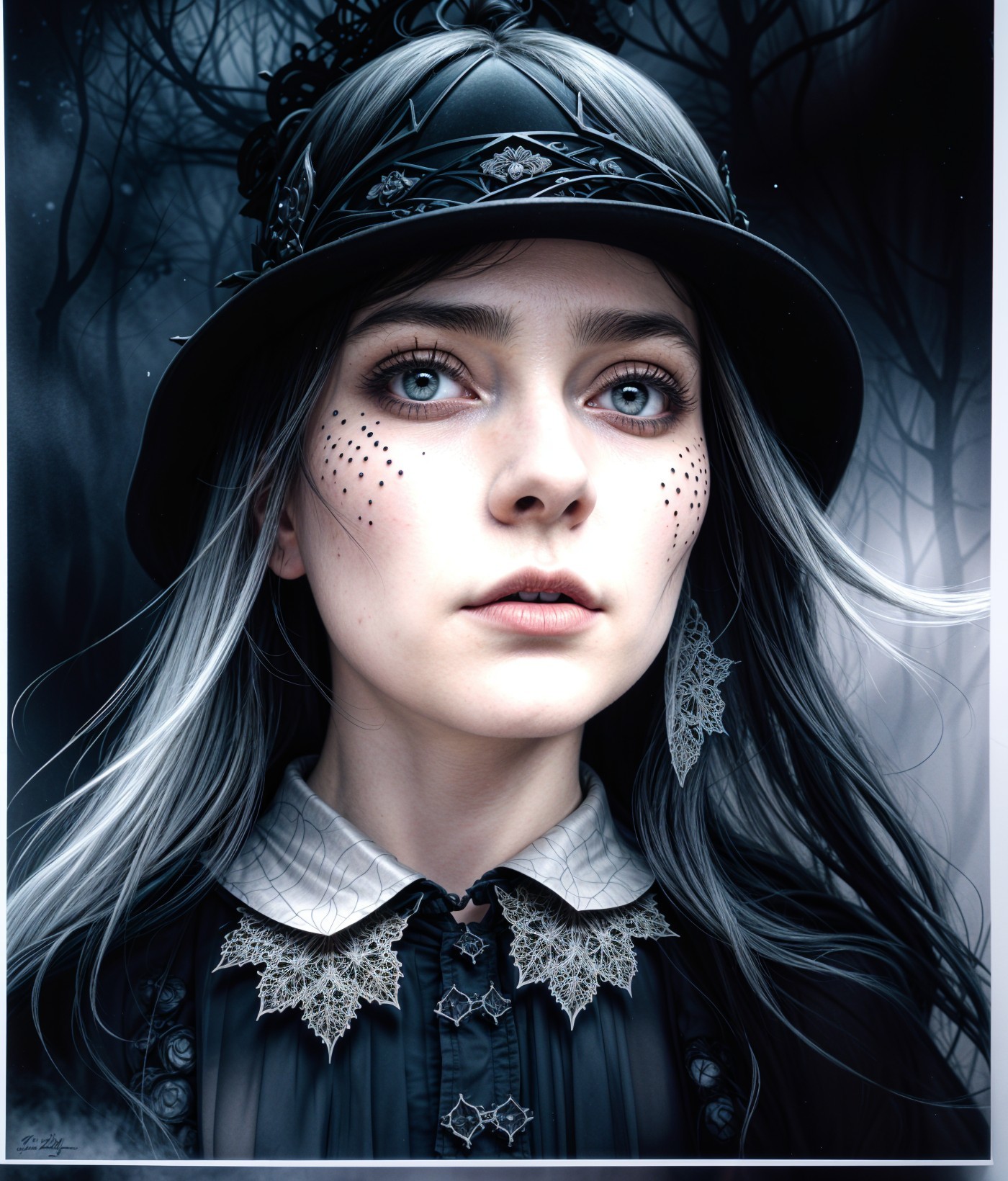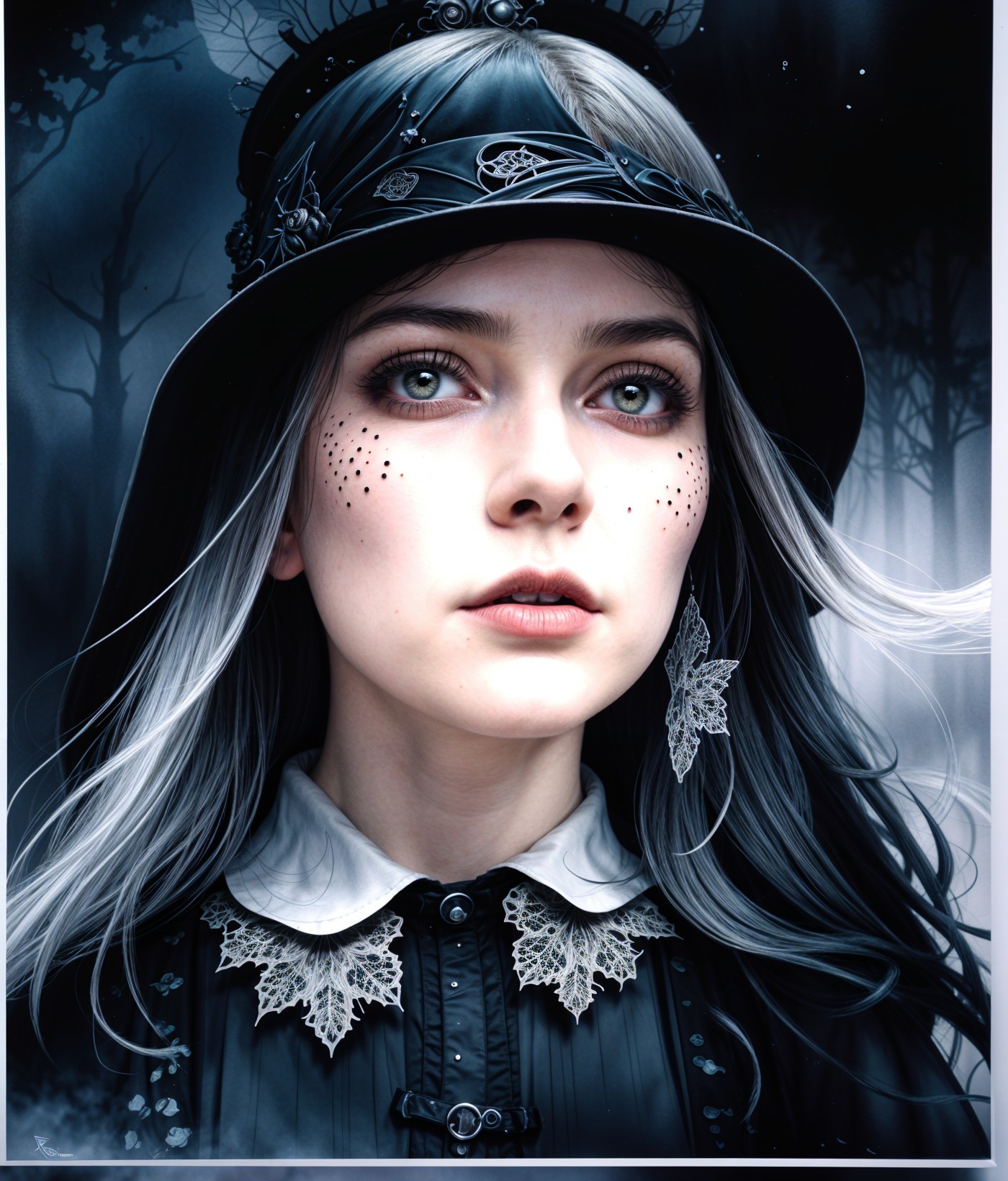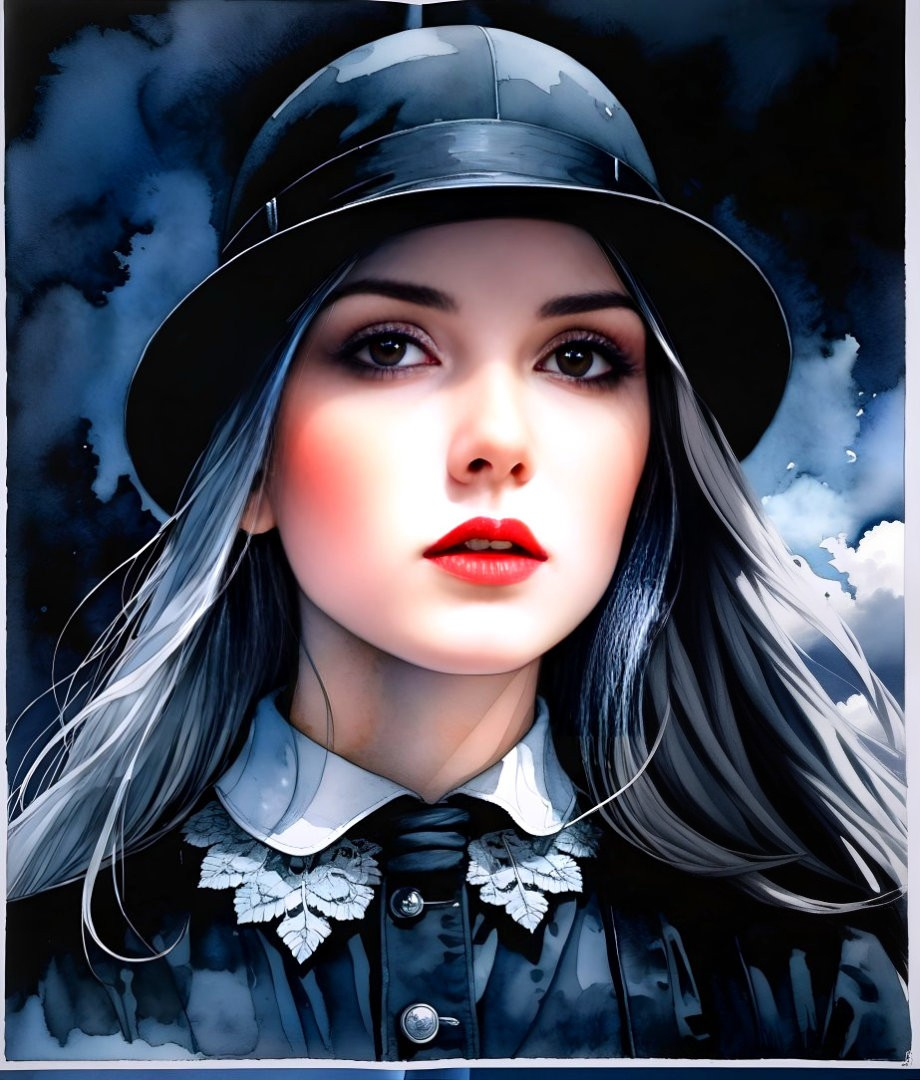 Prompt: A hauntingly ethereal watercolor portrait by Kurt Roesch and Paul Kidby, bowler hat with gothical details and felt fabric textures, blending ominous and fantastical elements in a dreamlike setting. French comic book art Infused with Gothic pen and ink details, diffusion, displacement mapping, dendritic structures and patterns that give it an otherworldly appearance, half-lit pores, fine lines, natural asymmetry, painterly effects, visible porcelain skin texture akin to kitsunegari, imaginative absurdism, detailed neck and throat, enhanced gradients, warm back-lit glow, cymatics vortex background, airbrushed fine lines, eerie and eldritch undertones reminiscent of Leonora Carrington and Naoto Hattori's styles, influences from Ed Binkley, provocative narrative. The lighting, inspired by Magritte and Alex Hirsch, adds a surreal touch,surreal sketchbook art, tesselated, micro-level intricacy, plasticity 1.3, large-scale complexity, colorful line-art by William Bradley, suppleness, flexibility, softness, pliability, malleability, litheness triadic color scheme metallic-honey deep-ochre light-green, micro-pen lineage, flowing line-art by William Bradley, hues by Ho Baron and Ed Binkley, vibrant color palette, dynamic lighting 1.3, intricate patterns, catenaries, delicate linework, revealing, lascivous, sleazy, magical atmosphere, intricate bas-relief effects, blurred background, contoured, dyed, debeh, bokeh, dof, moving, accelerated, action painting reminiscence, unique, warm coloring with ink lines over watercolor effects, tesselated, stylized, stippled, blotting, watercoloring techniques, tousled, overexposed, brightness 1.3, pen and ink style, posing, motility, quillling, intricate and detailed with crisp quality. Incorporate a colorful tribal complementary color scheme with thinned paint for 3D effects and subsurface scattering 1.3 for watercolor washes in warm tones, casually textured layers,intricate line art, diffused highlights, mip-mapping textures, glossy shimmering effects, collagraphy with low key lighting, contrasting textures, translucent geometry, elegant geometric features, imperial colors, dark tones, dynamic accents, illusion of depth, sgraffito masterpiece style, embossed hues and contourings, small brushstrokes, contourings, defined edges, tiny and lean lines, orphism, abstracted collage reminiscence, fusion of synthetic essence and abstract art, color palette inspired by William Bradley's and Carne Griffith's coloring style, included paper cuts,displacement mapping, plasmatic hatchings, scratched edges, cel-shaded style, Emshwiller influence, sfumato, Bloom-Effect, interpolated, serene expressionism by Michael Cheval, anti-aliasing, deep scale and perspective, surrealism, mip-mapping, phong shading 1.3, texture mapping 1.3, luminousity 1.3, crackling lightning, fuzzy textures, and linty details with strict outlines, all contributing to a mesmerizing and mysterious visual experience.