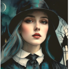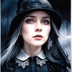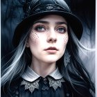 The image features a young woman with striking gray hair and unique makeup, including dotted patterns under her eyes. She wears a vintage-style black hat adorned with flowers and bat accents.