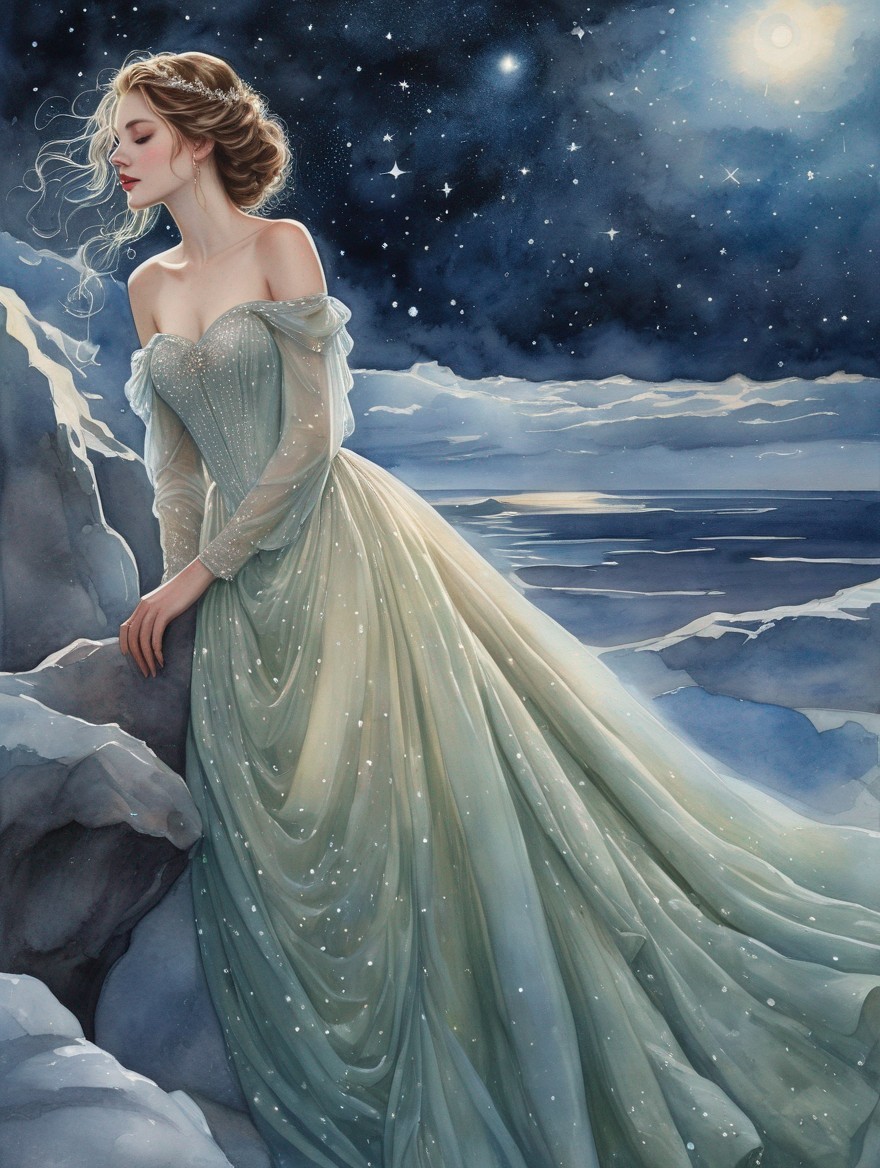 An elegant woman with flowing dark hair adorned with a bejeweled golden headpiece, earrings, and necklace, set against a starry backdrop.