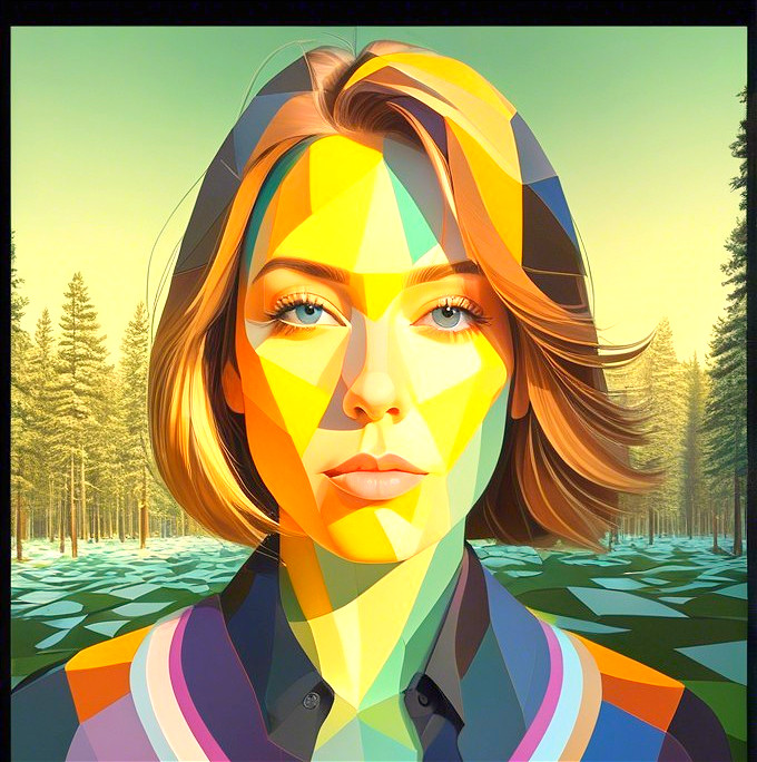 Stylized Portraiture, surreal patchwork by Jessica rossier, portrait of a woman with many gorgeous juvenile characteristics, forestal background, hues by William Bradley, parallax occlusion 1.5, highly attractive human, gradient inking colors, soft light, whitish colors, gothic style, light and shadow, pen and ink, dreamy atmosphere, xeroxed with Hasselblad 60mm f3.5 Distagon CF, 135mm photography, raytraced shadows 1.2, multi-layered eyes with reflections, op art elements, stippled, tessellated, pointillism details, gossamer, detailed patchwork style with fractalization and triadic color scheme beige red auburn, saturated colors, plasticity 1.3, complexion 1.1, ambient occlusion 1.2, reminiscent of Leonora Carrington and loui jover and duy hunh. Spectral cold colors, very light green white and yellow, sunset with light, snow flakes, grasses, dimmed lights, light curly clouds, extremely, blotting watercolor details: stylized trees, winterly desolate, gloomy dreamy scene,