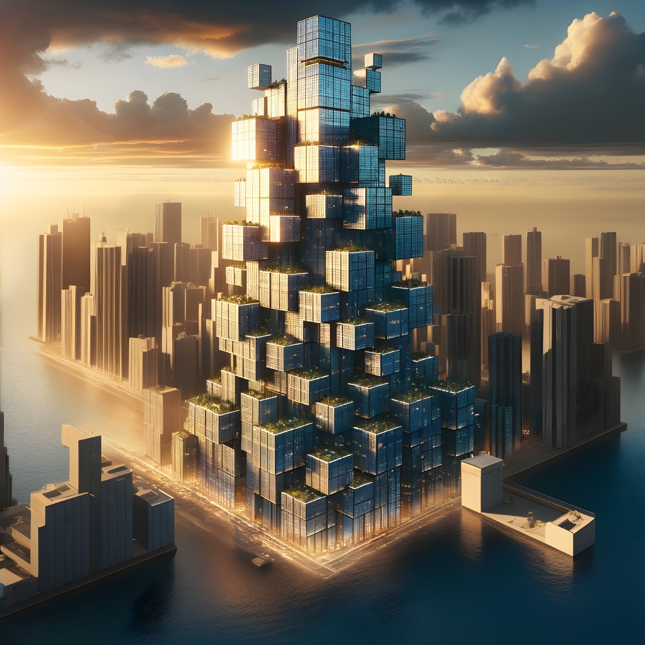 A futuristic skyscraper resembling stacked cubes glows at sunrise over an urban waterfront skyline.