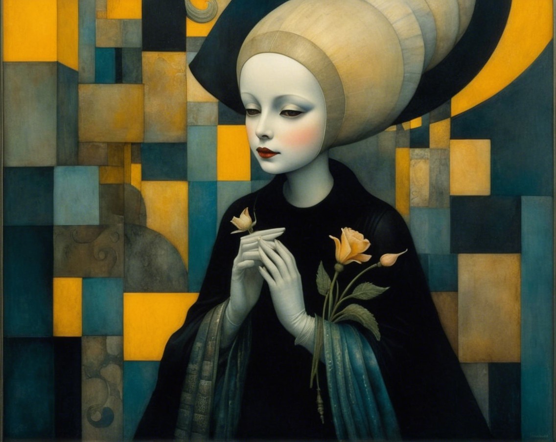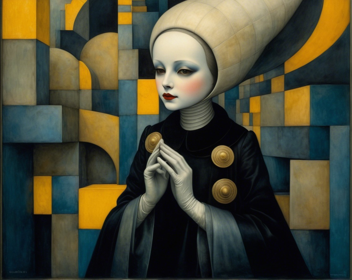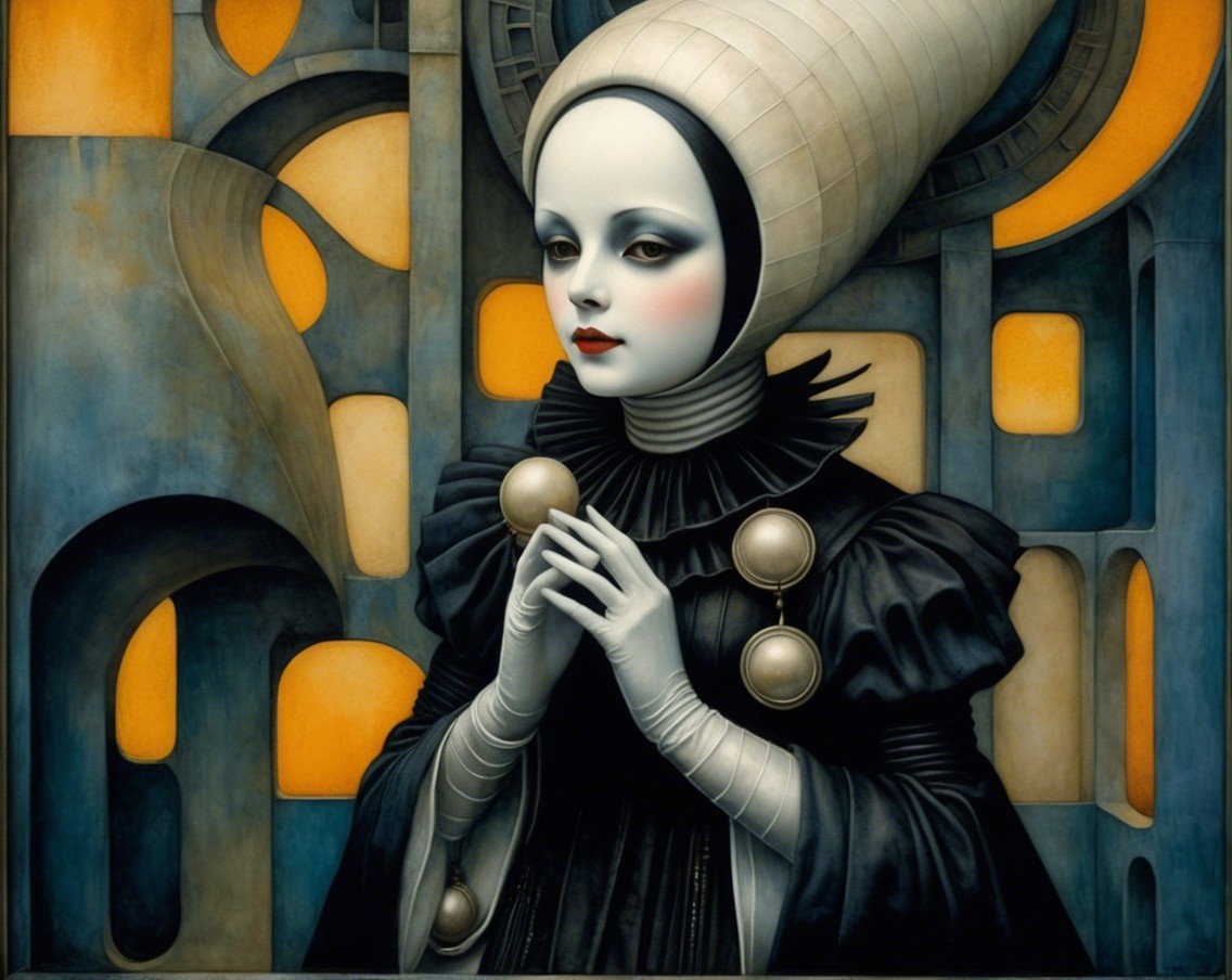 A mystical figure with a pale face and large eyes, dressed in a black, ruffled gown, sits against a cosmic backdrop of golden and blue circles, exuding a surreal, ethereal presence.