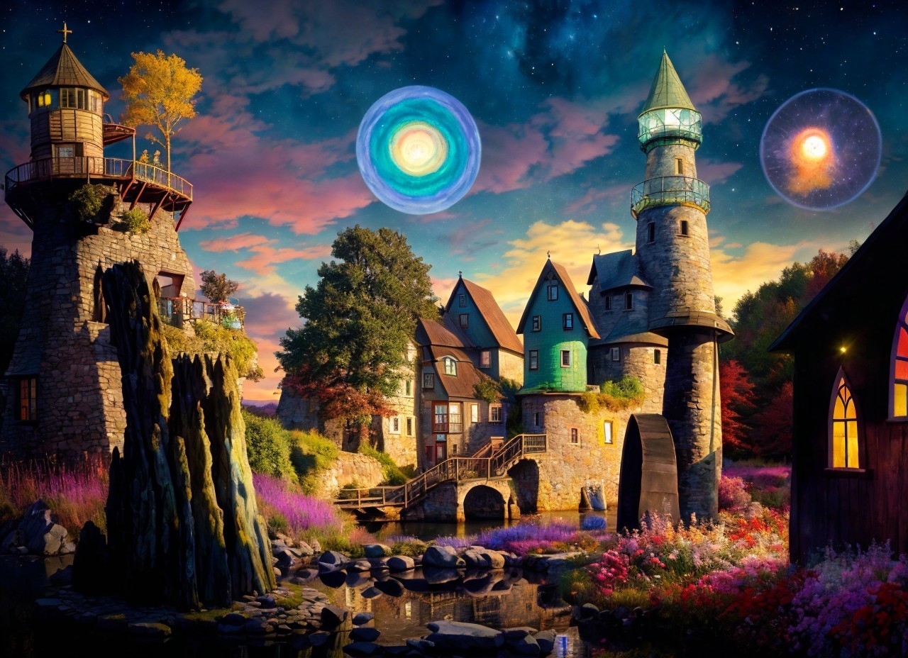 Prompt: Highland castle by lake, watermill, vortex monument. colorful cosmic sky, Beautiful water reflections. Giant statue. Trees. Landscape filled with colorful rocks. Mixed media details by Tim Burton and Egon Schiele.