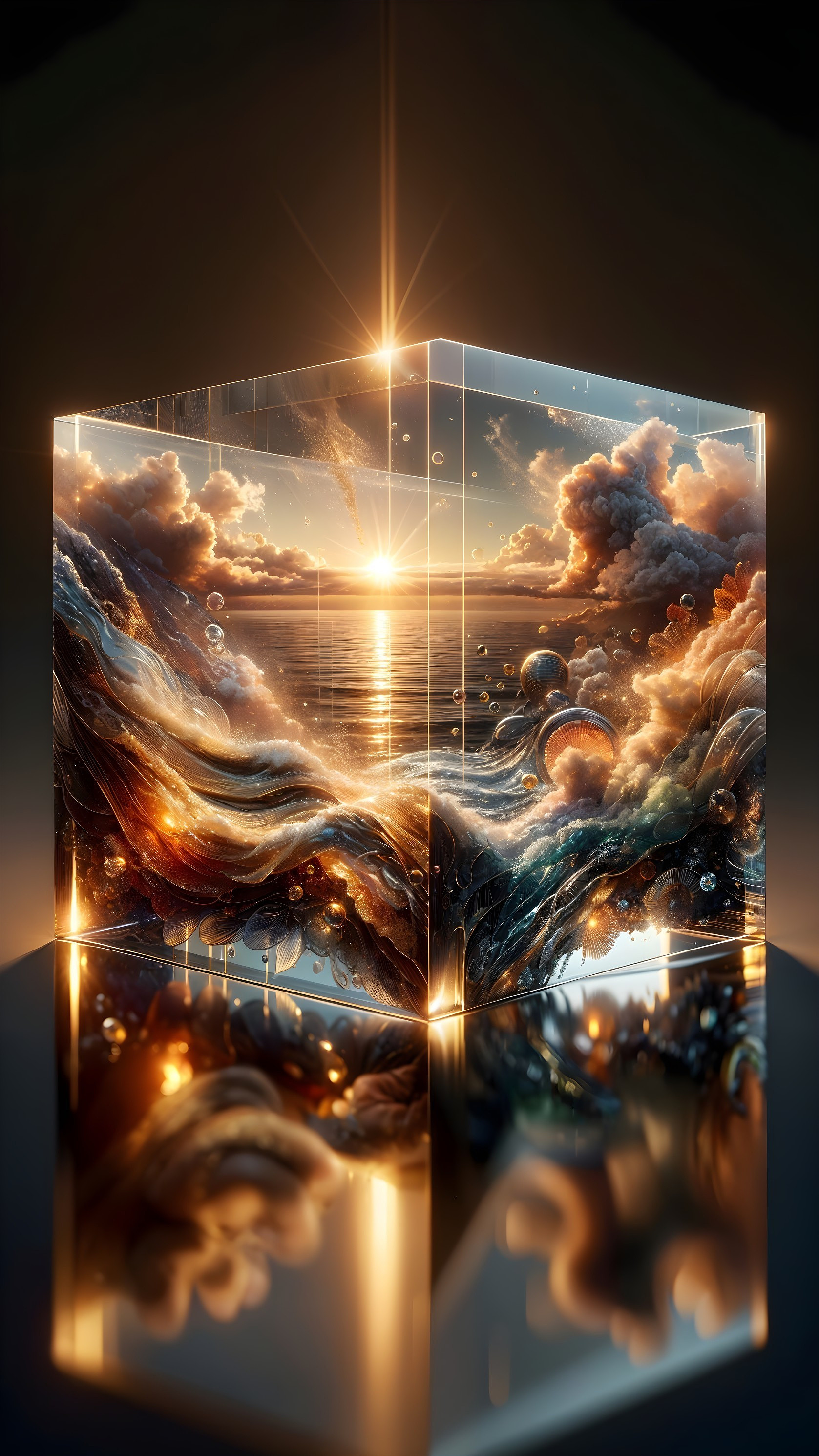 A stunning digital painting showcases a sunrise sea within a glossy glass cube, featuring intricate double exposure and hyper-realistic details. The earthy palette and dynamic lighting create a breathtaking atmosphere.