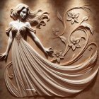 A delicately sculpted figure of a woman in a flowing gown, gracefully posed against a textured background. The artwork features intricate details, combining elegance with a soft earthy palette.