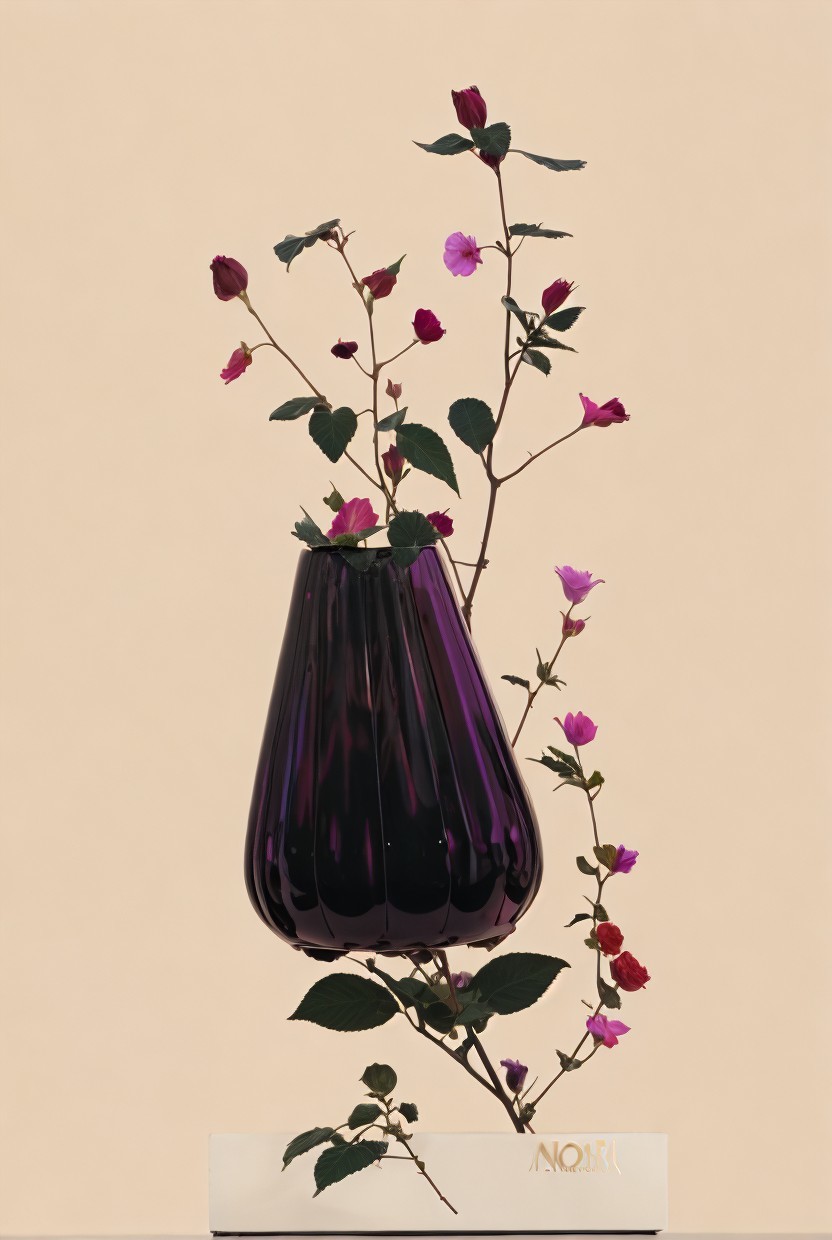 Inverted Teardrop Vase with Purple Flowers and Leaves