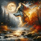 A majestic fox stands by a serene stream in a vibrant autumn forest. Golden leaves fall around, and a soft mist rises from the water, creating a peaceful, enchanting atmosphere.