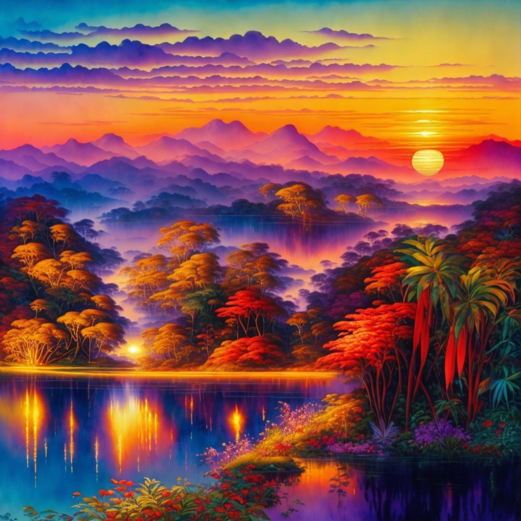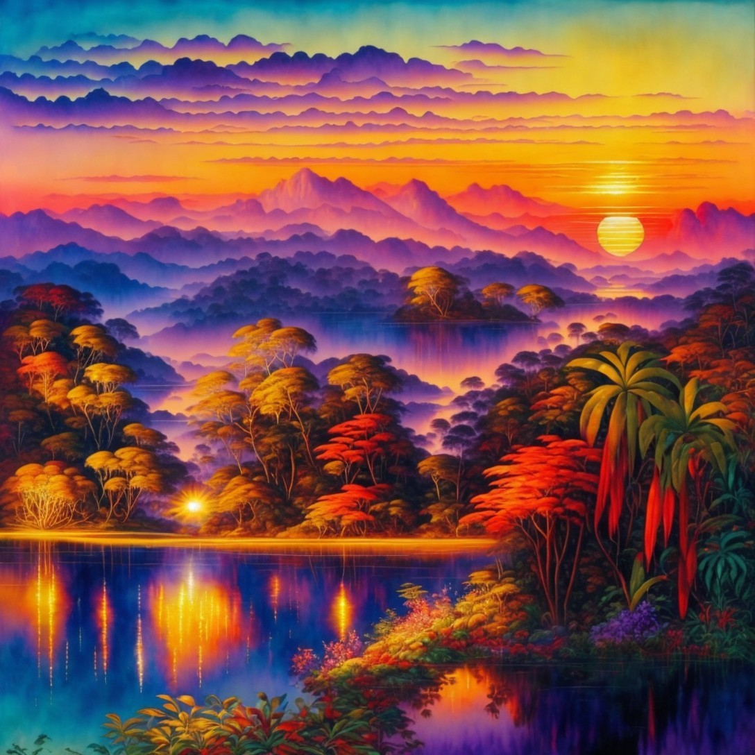 Prompt: Full page, single image, beautiful high definition, fantastic view, wide scene, 3D watercolor patchwork, sunset, dense Rainforest jungle, large plants, tropical flowers in shades of red to violet, reflections in winding river, intricate, satiny, high quality, shimmering, vibrant colors, by William Turner, with elements in Gustav Klimt style