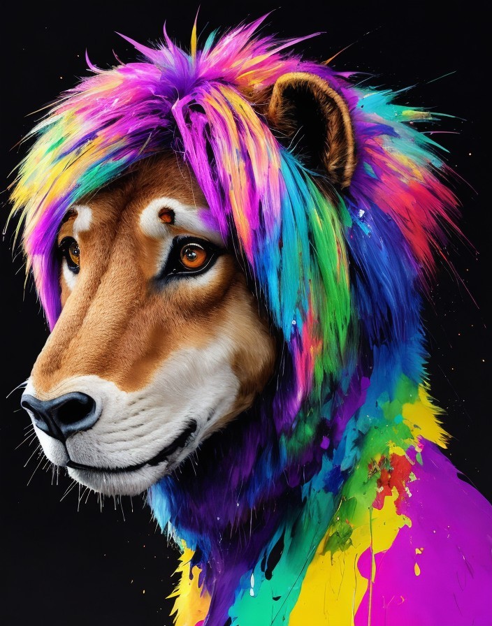 A vibrant, stylized lion with a colorful, rainbow-hued mane stands against a black background, showcasing a blend of artistic paint splashes and a whimsical, modern design.