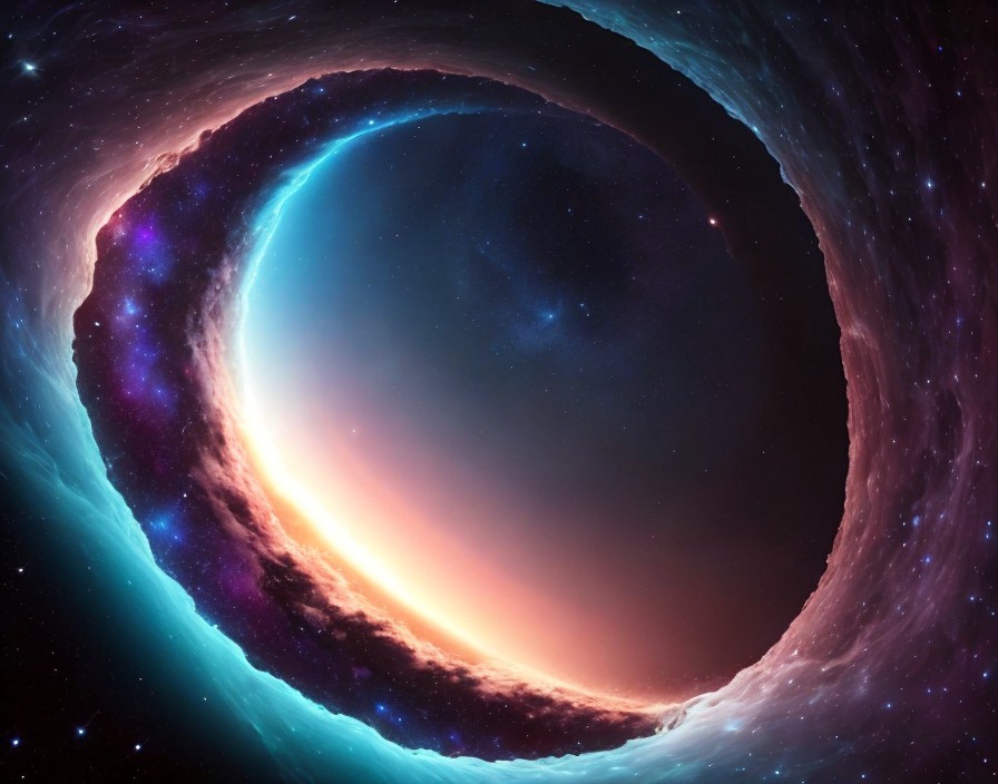 A vibrant depiction of a black hole surrounded by swirling cosmic lights and stars in deep space.