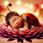A peaceful baby, dressed in a ladybug hat, sleeps nestled within a large, vibrant pink flower. The scene is magical, with soft bokeh lights adding a dreamy atmosphere.