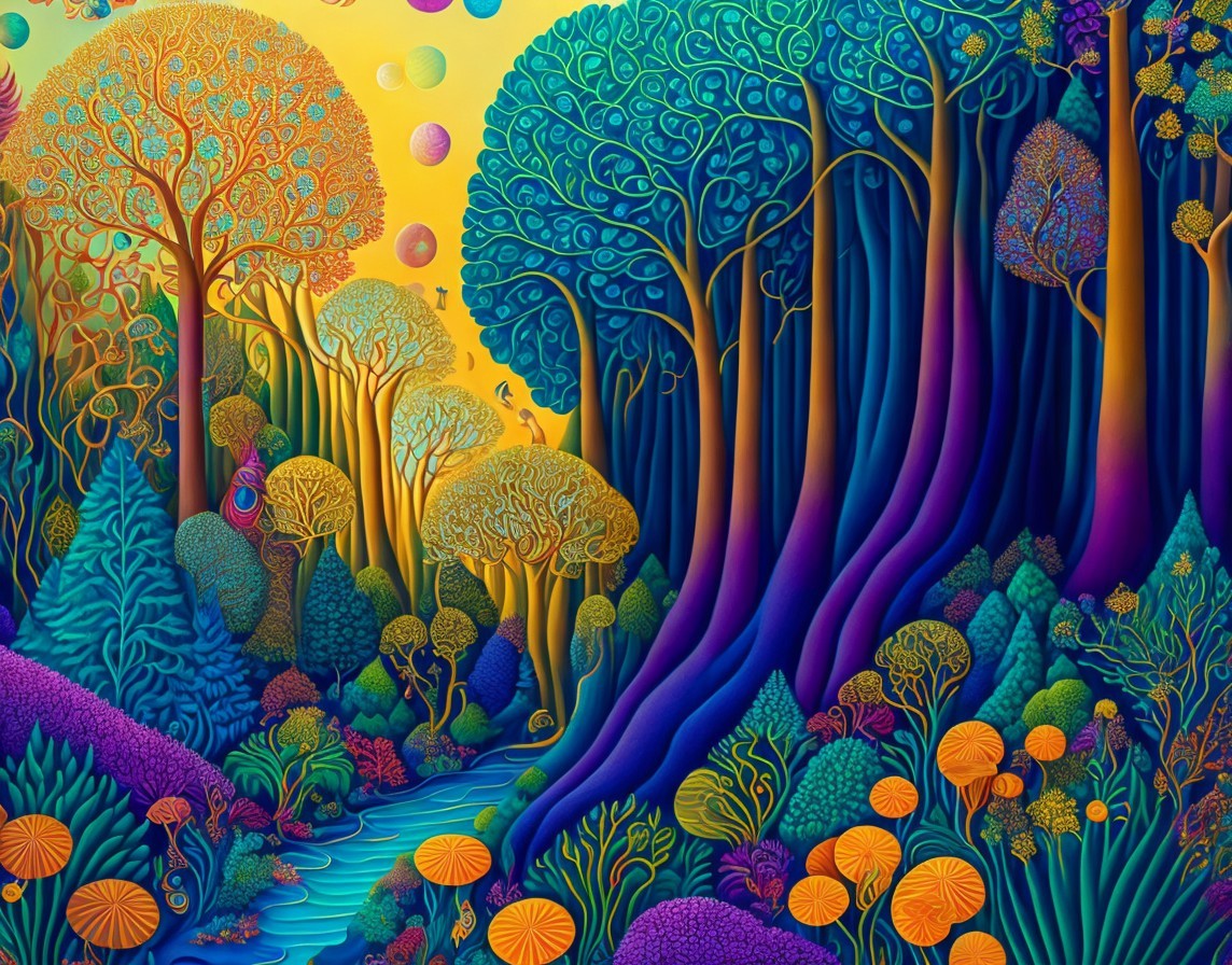 Transition to the right, trees with deep blue leaves featuring bright sky-blue speckles and purplish trunks inhabit the scene, forming a dense forest. The forest floor is alive with lush, electric blue foliage with neon orange, pink, and purplish round flowers dotting the scenery. A small, meandering stream runs through the middle of the composition, reflecting the intense blues and yellows of the surrounding environment with tiny waves adding to the magical ambience.