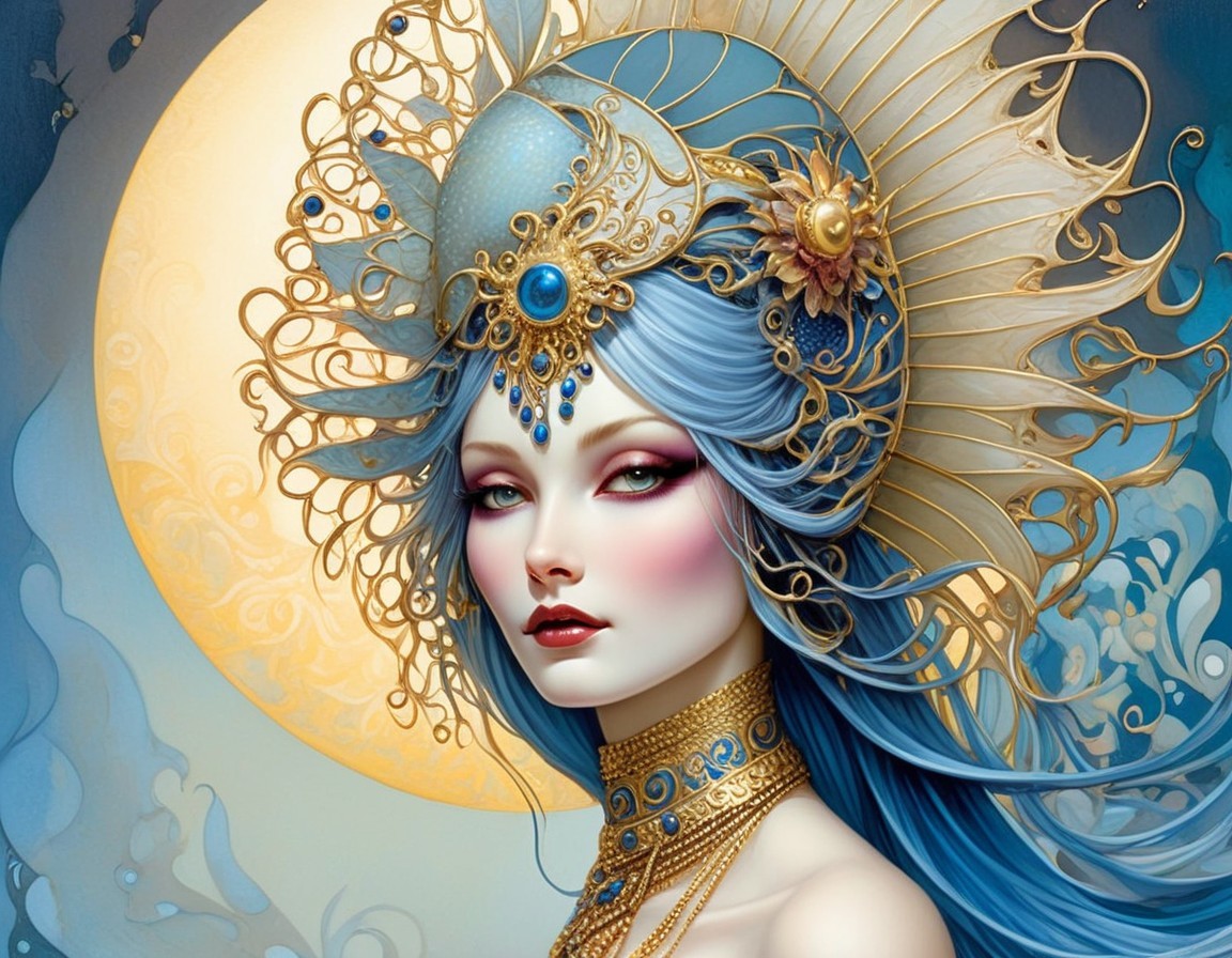 Prompt: In the garden of my childhood, I learned to dance with shadows. The sun set early, leaving behind a world shrouded in darkness. colors pale blue, gold, grey, burgundy, indigo