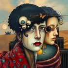 A surreal artwork featuring two faces merging together, adorned with intricate accessories. The backdrop shows a dreamy desert landscape with a moon and abstract elements, creating a mystical vibe.