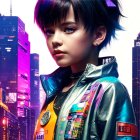 A vibrant portrait of a young person with short, dark blue hair and striking green eyes. The background features bold, swirling colors, adding energy and depth to the artwork.