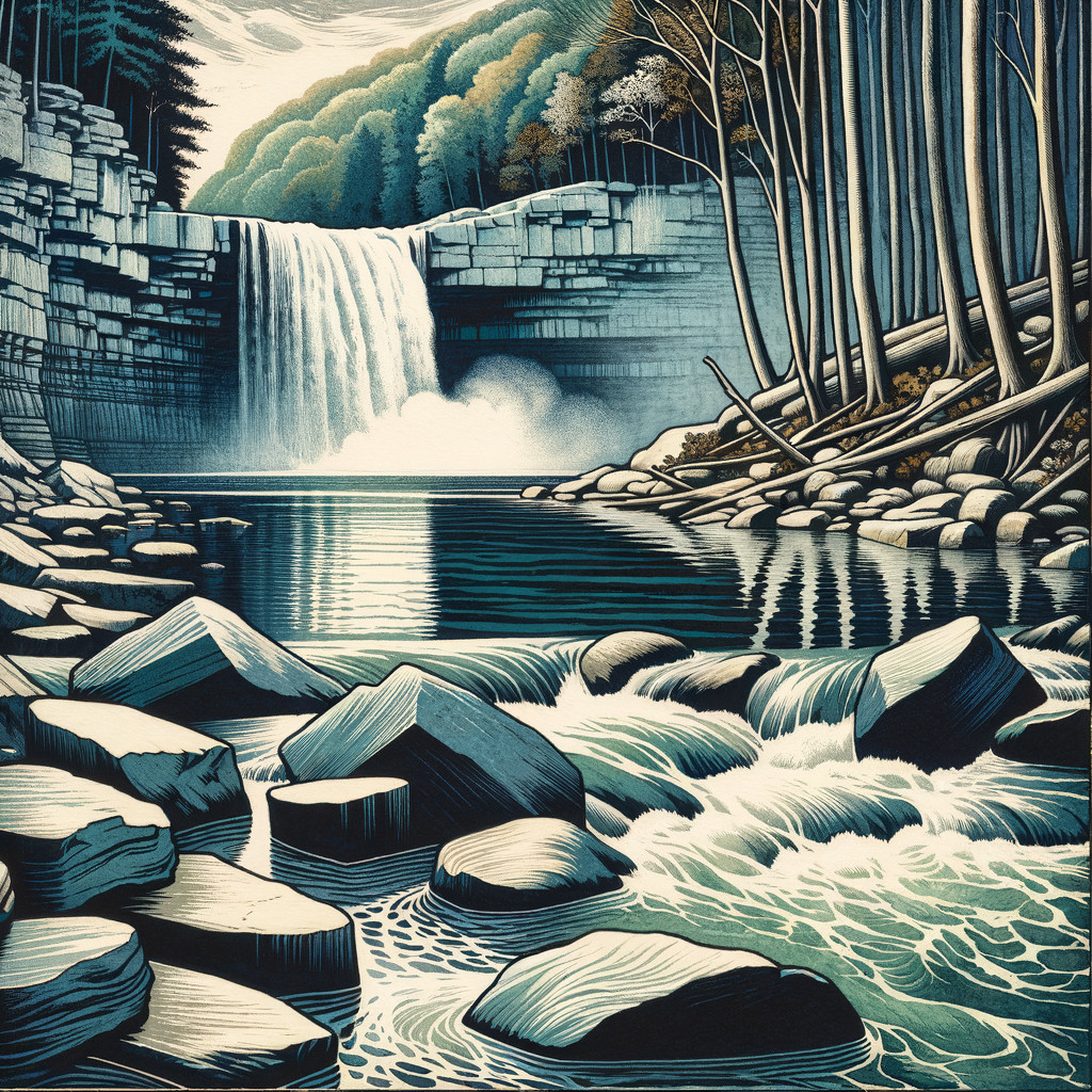 Prompt: imagination and perseverance, MC Escher , Bash Bish FAlls, Copake , NY 1956, upstate camp and lake, ,more colors and these, slate, navy blue,, white, dark grayish turquoise, muted green pastels, Watercolor painting william morris translucent linocut Transparent