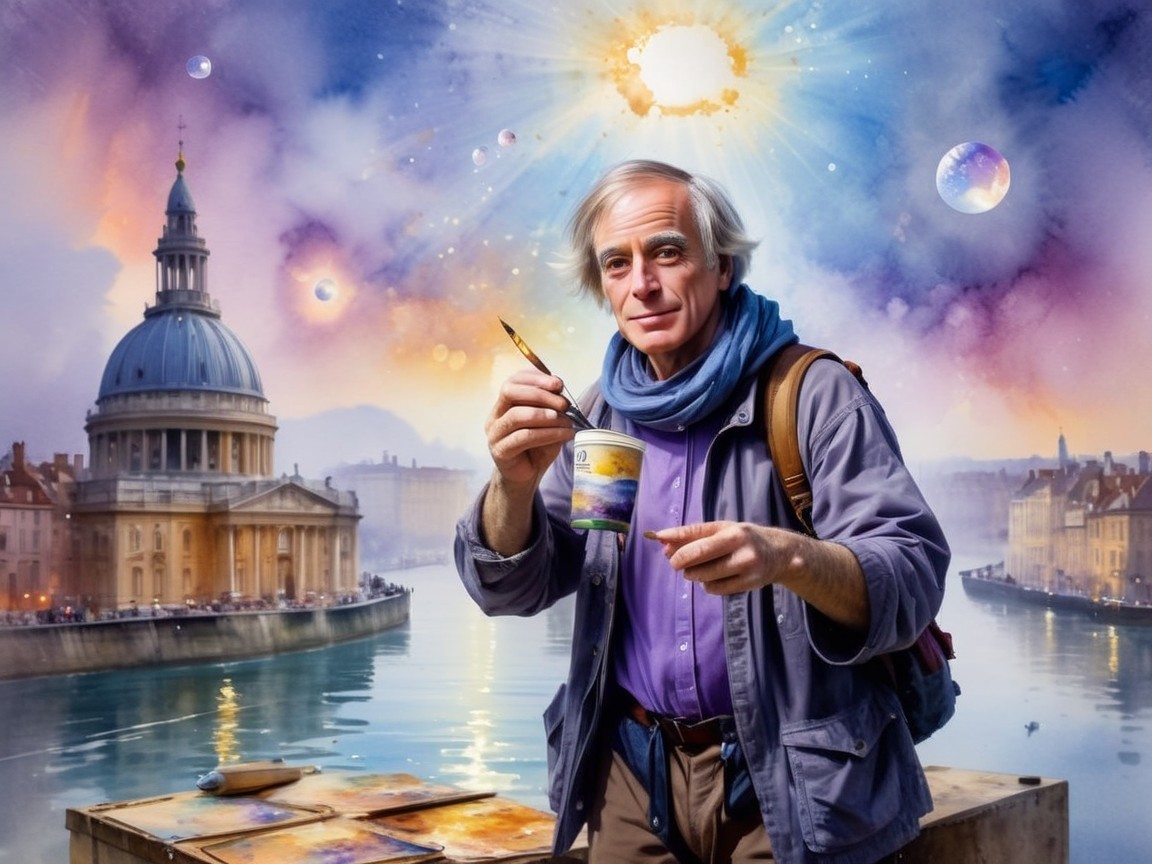 A painter stands by a serene waterfront, holding brushes and a palette. Behind him, a vibrant sunset reflects on the water, illuminating charming buildings along the canal.