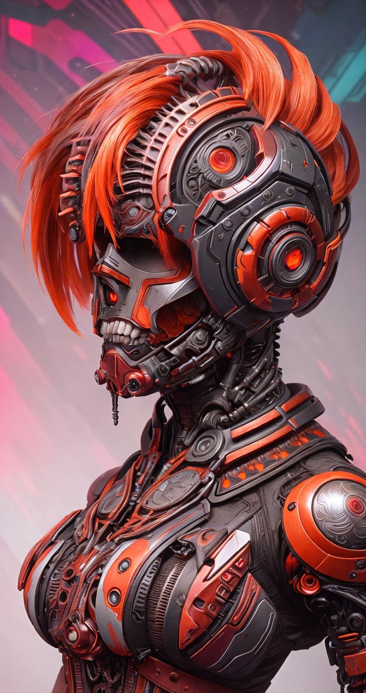 Style of H r giger, upper body portrait, digital painting, concept art, stylized biomechanical details, high tech, CyberTech Elements of Aleksander Rostov and Kevin Beilfuss , organic vibrant colors, fauvistic style, reddish rim lighting, cyberpunk ornamental details, plushy psychpomp scene 1.7, high colorization, digital photography, hues, luminous iridescence, dynamic lighting, 3d effects 1.8, saturated colourful textures, triadic color scheme red black grey, saturation 1.7, negative-digital, surreal background, 3d effects ,brightness 1.4, volumetric plushy psychpomp, colorful reflections, lavish Science-fiction figurine, intricate facial details, pop art patchwork, biomorphic shapes, biomechanical details, tints of 1970s advertising art, dark fantasy art portrait
