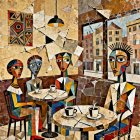 The artwork features two stylized figures in a colorful, abstract setting. They sit at a table adorned with geometric patterns, surrounded by vibrant circles and shapes, creating a lively atmosphere.