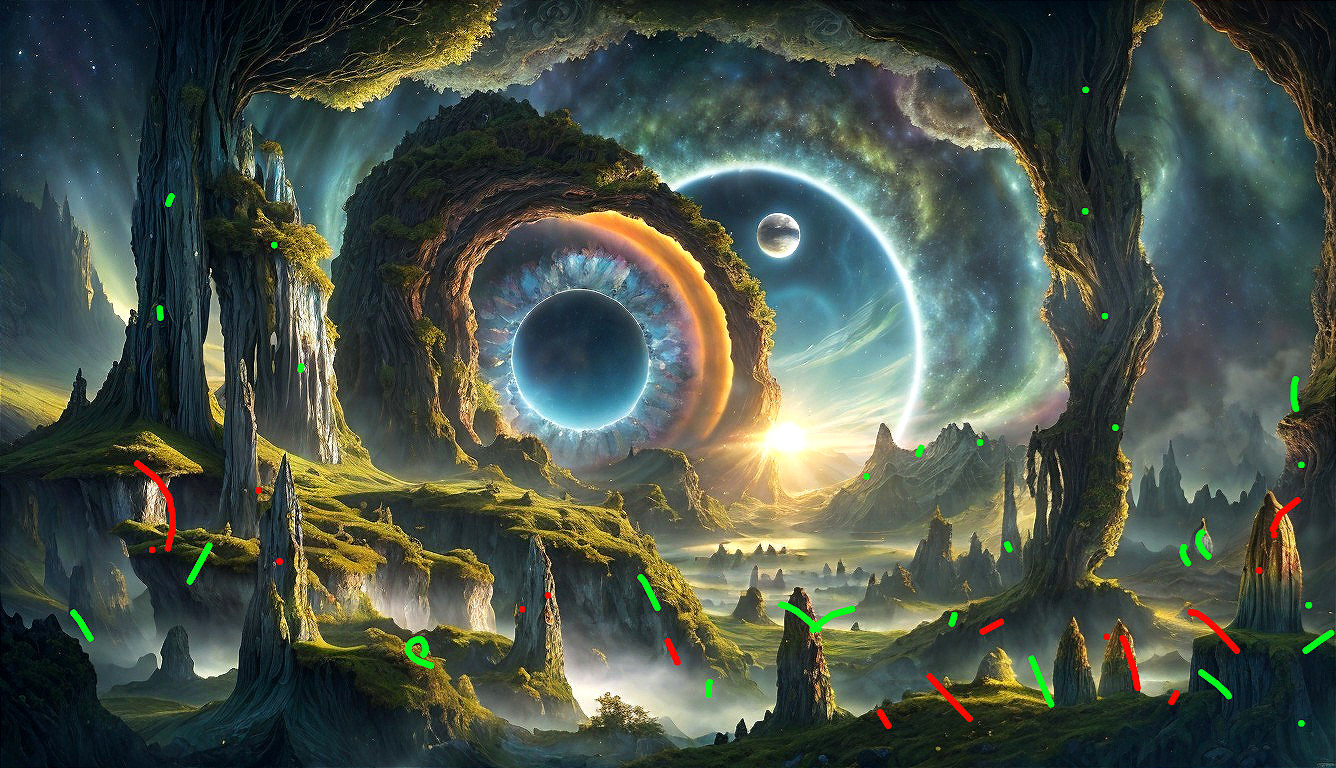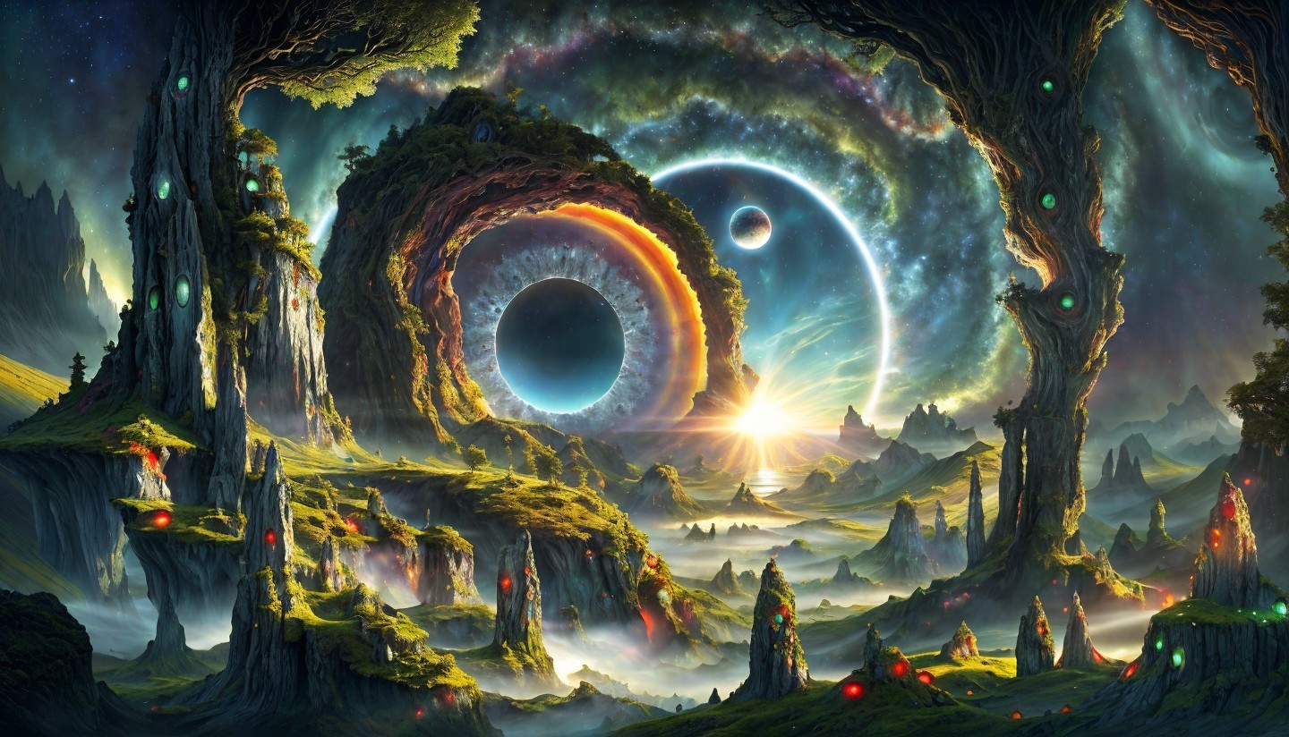 A surreal landscape features ancient ruins and lush greenery beside a serene lake. Celestial bodies and vibrant planets fill the sky, creating a magical, otherworldly scene.