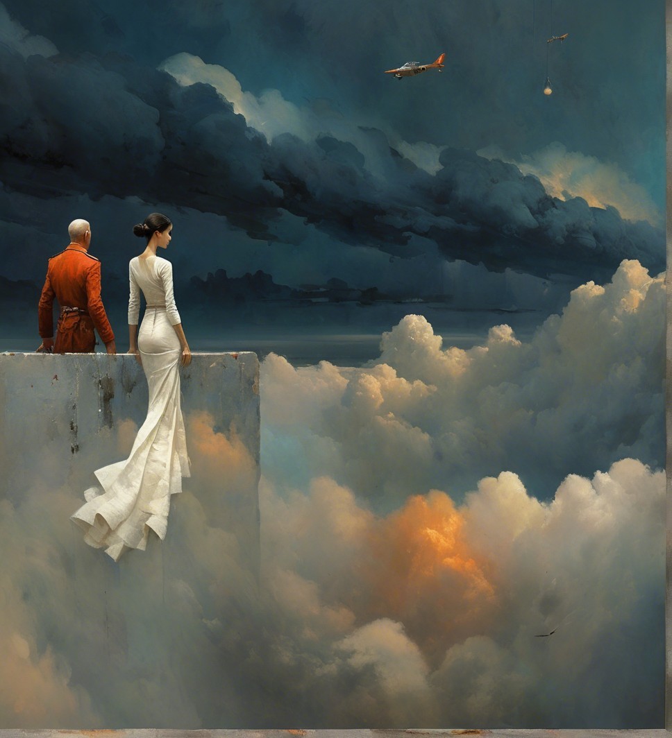 A couple stands on a cloud's edge, gazing at a turbulent sky filled with dramatic clouds and an airplane overhead. The scene blends surrealism with a sense of wonder and adventure.