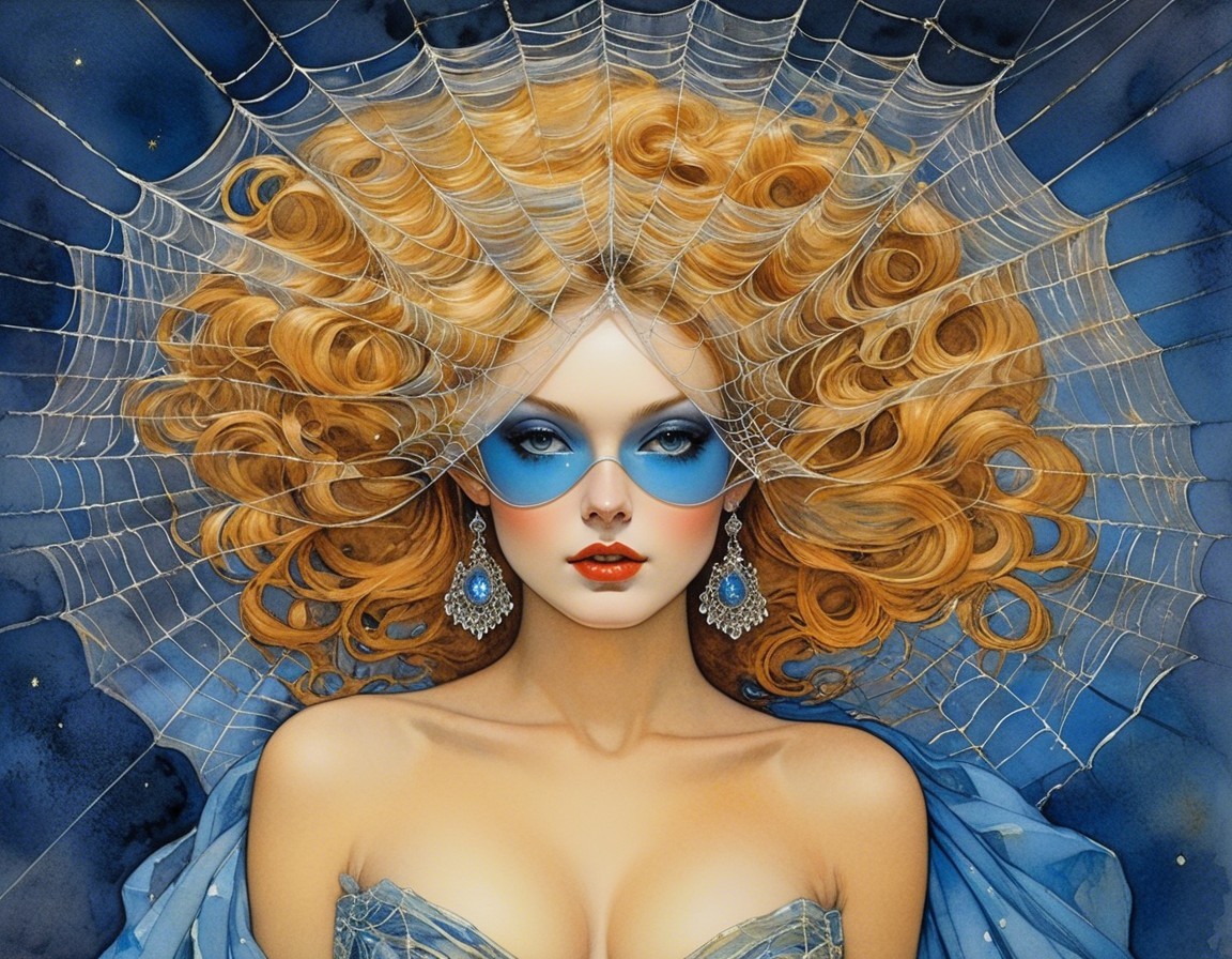 A woman with flowing red hair gazes elegantly, framed by a delicate web-like umbrella adorned with autumn leaves. She wears sparkling earrings and a soft, ethereal gown, exuding a magical aura.