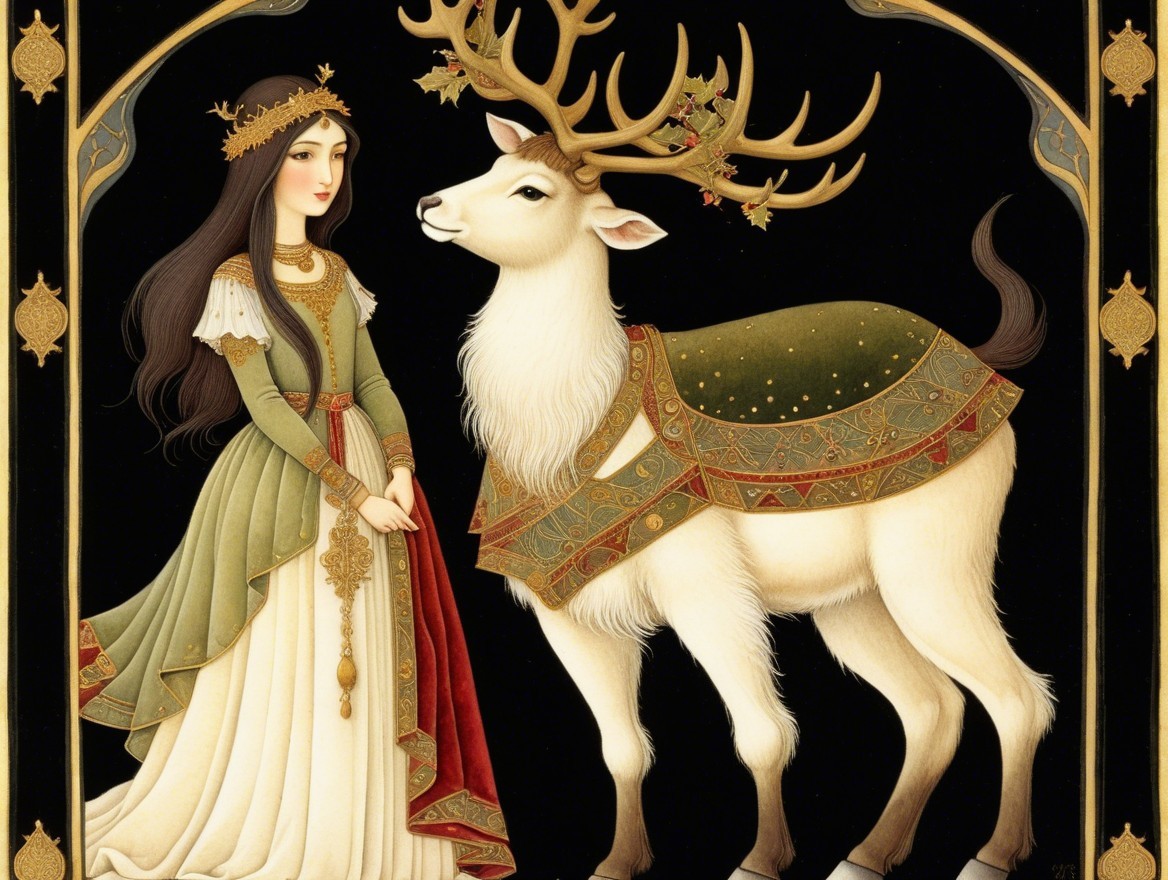 Legend of the girl and the magical reindeer,, 3rd century Persian miniature art. Velvet Black, Shabby, Dull Gold, olive green, burgundy, Golden Ratio, Surreal Fantasy, Elegant, High Definition Ultra Fine 3D Line, Zenangle Style, Watercolor Patchwork , Arthur Rackham Style, Paul Kidby, Gediminas Prankevicius, Jacek Jerka, Extremely Detailed, Intricate, Thoughtful, HDR, Fractal, Beautiful, Award Winning, Fantasy Look, Fantasy, Crisp Quality