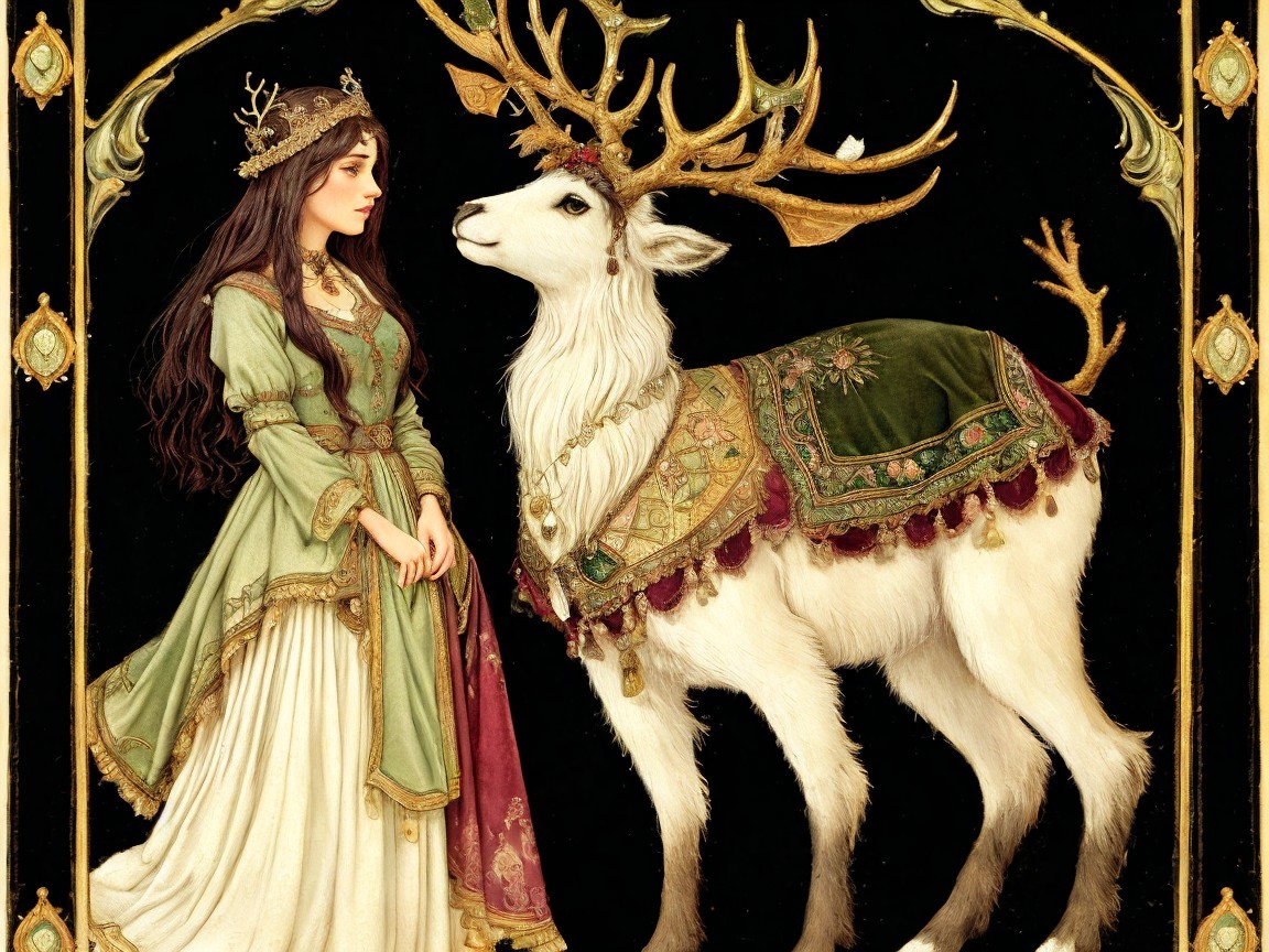 Prompt: "Legend of the girl and the magical reindeer,, 3rd century Persian miniature art. Velvet Black, Shabby, Dull Gold, olive green, burgundy, Golden Ratio, Surreal Fantasy, Elegant, High Definition Ultra Fine 3D Line, Zenangle Style, Watercolor Patchwork , Arthur Rackham Style, Paul Kidby, Gediminas Prankevicius, Jacek Jerka, Extremely Detailed, Intricate, Thoughtful, HDR, Fractal, Beautiful, Award Winning, Fantasy Look, Fantasy, Crisp Quality