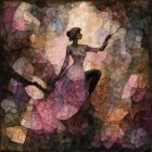A woman in a flowing grey dress sits on a bed in a dimly lit room, gazing contemplatively. A swirling cosmic backdrop with two moons enhances the mystical atmosphere, illuminated by vintage lamps.
