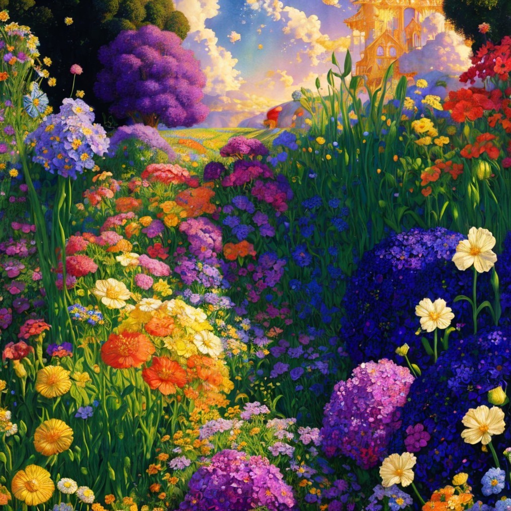3D watercolor patchwork, beautiful detailed intricate peaceful meadow, extremely beautiful high resolution fantasy flowers, luminescent, sparkling, satiny, high quality, shimmering, vibrant saturated colors, elegant, highly detailed, glistening magic style, by Maxfield Parrish, with elements in the style of Jan Toorop and elements in the style of Gustav Klimt