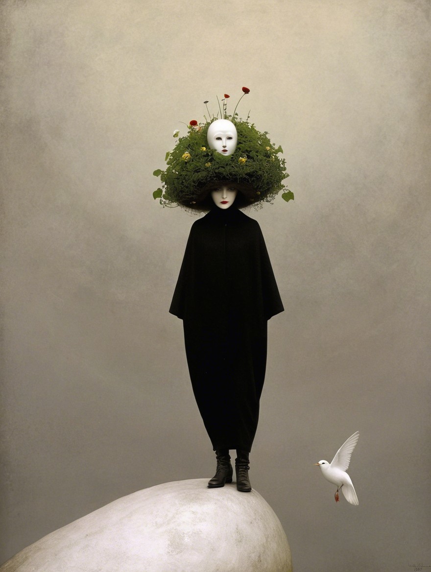 A mysterious figure in a black dress with a high collar and floral details walks along a stone path, holding a basket of flowers amidst ethereal greenery and butterflies in a dreamlike setting.