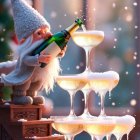 A whimsical image features a gnome or Santa-like character holding a colorful bunch of balloons, surrounded by a celebratory winter setting. The character, positioned on the right side of the frame, has a jovial expression with rosy cheeks and a long, white, flowing beard. He wears a light blue pointed