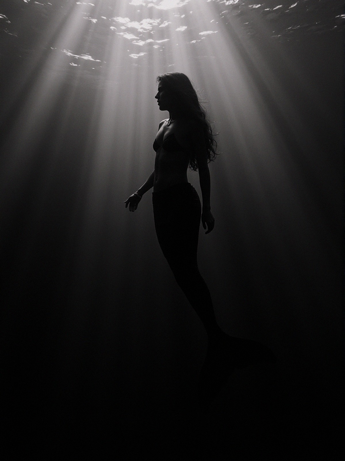 A silhouette of a mermaid swims gracefully underwater, framed by beams of light penetrating the surface, creating a mystical and serene atmosphere in the deep blue waters.