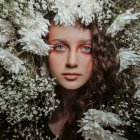 A captivating portrait of a serene woman with striking blue eyes, her hair entwined with flowers and branches, creating a harmonious blend of nature and beauty.